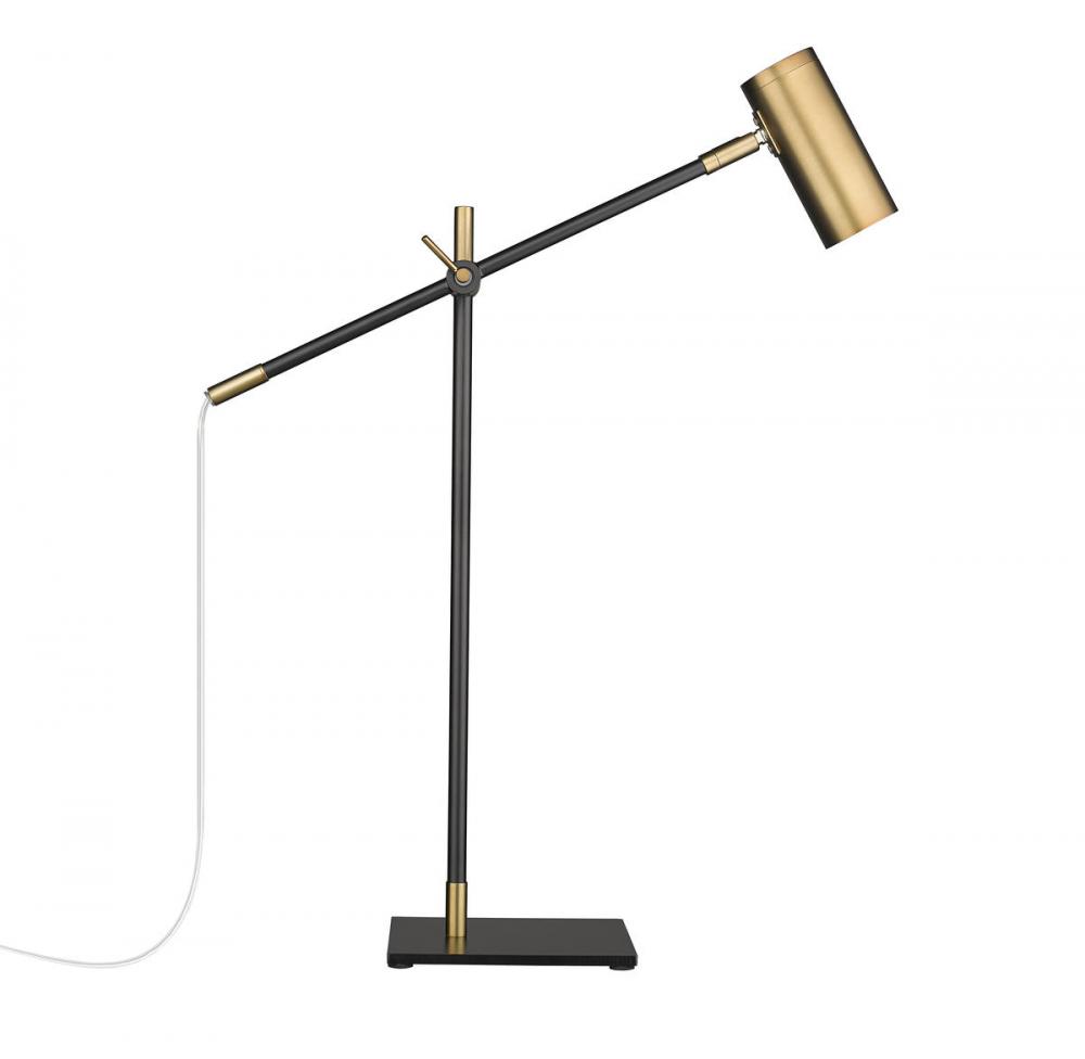 This contemporary table lamp with a cylindrical shade will illuminate your home office or living room. Serving as the ultimate task light, this fixture is constructed of steel in a matte black finish and olde brass accents for a sleek and simplistic appeal.