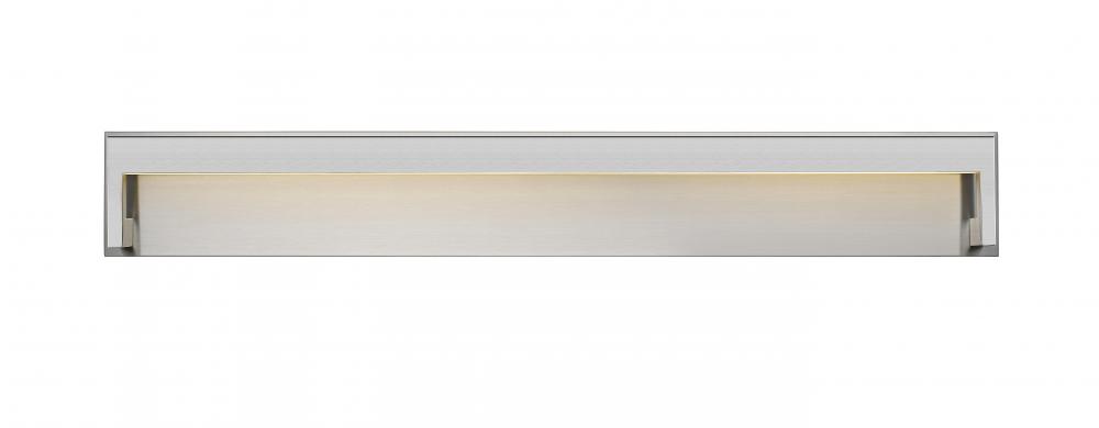 A slender horizontal silhouette draws the eye in a fashionable direction, adding luster to modern bath spaces. Beautifully finished in brushed nickel, this one-light vanity fixture features an obscured acrylic diffuser and the energy-saving bonus of integrated LED technology.