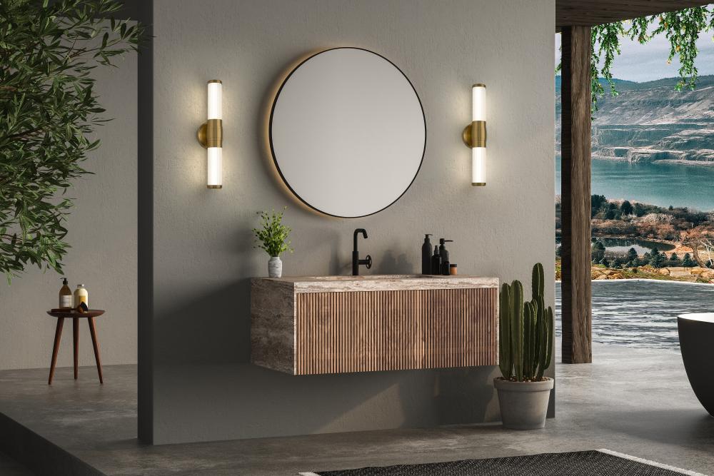 Modern gold finishing creates sophisticated warmth for the clean lines of this modern LED vanity bath light. The integrated LED is dimmable and energy efficient, offering five color selections to ensure the perfect ambiance for your space. The fixture features delicately ribbed cylinders of opal glass, ensuring inviting illumination.