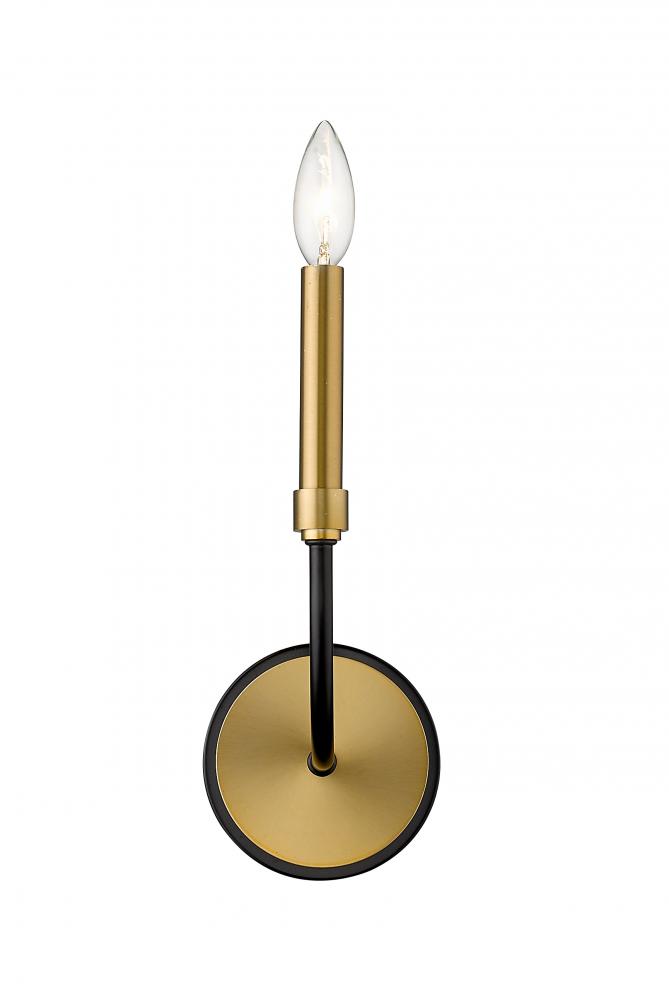 Add this warm two-tone one-light wall sconce to your favorite space for simple elegance. Its crafted in a classic matte black and olde brass finish with the light in a candle-like design. Its a richly-toned understated design perfect for the bathroom, powder room, hallway, or bedroom.