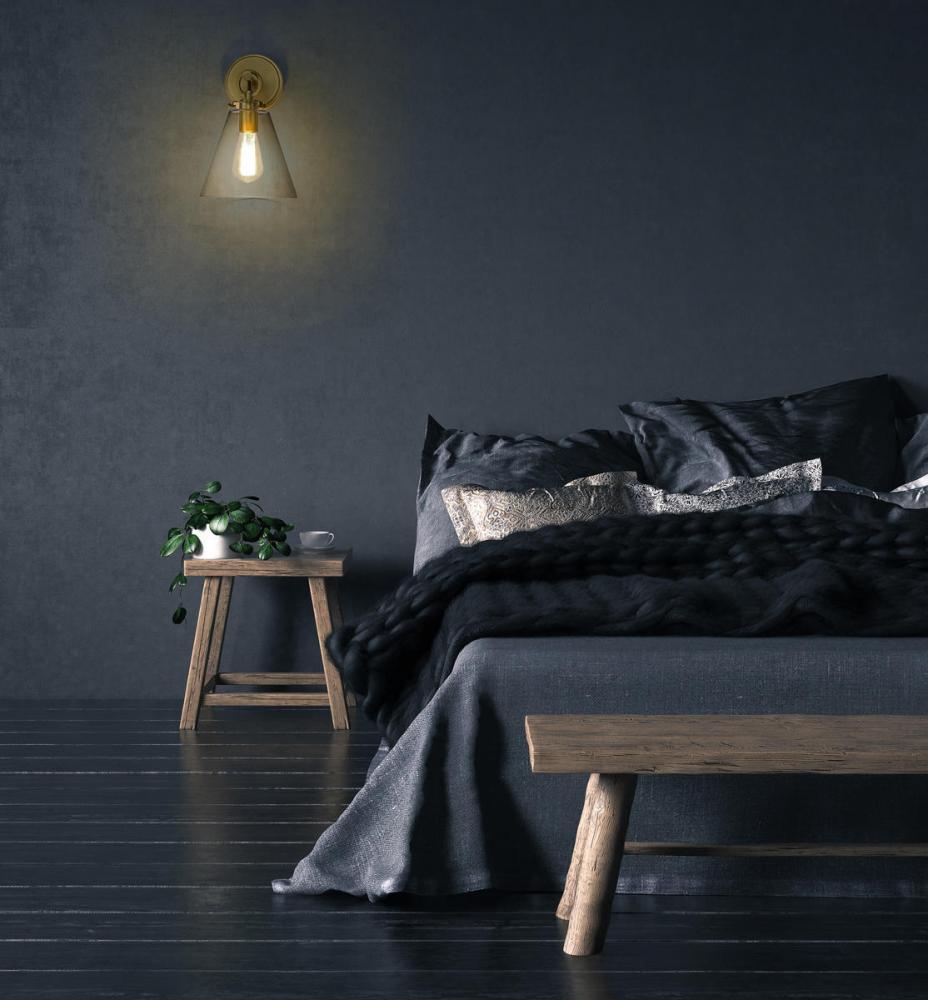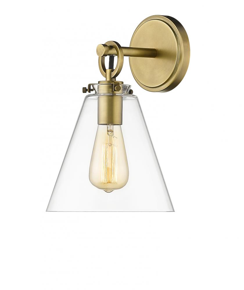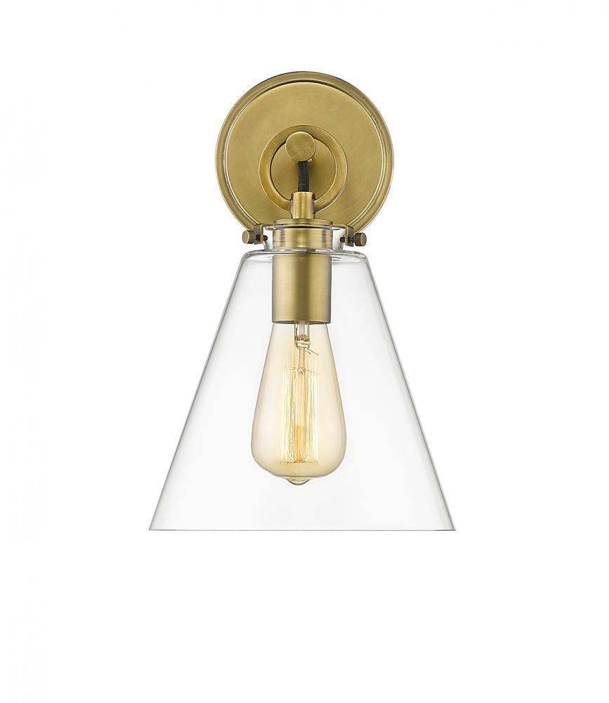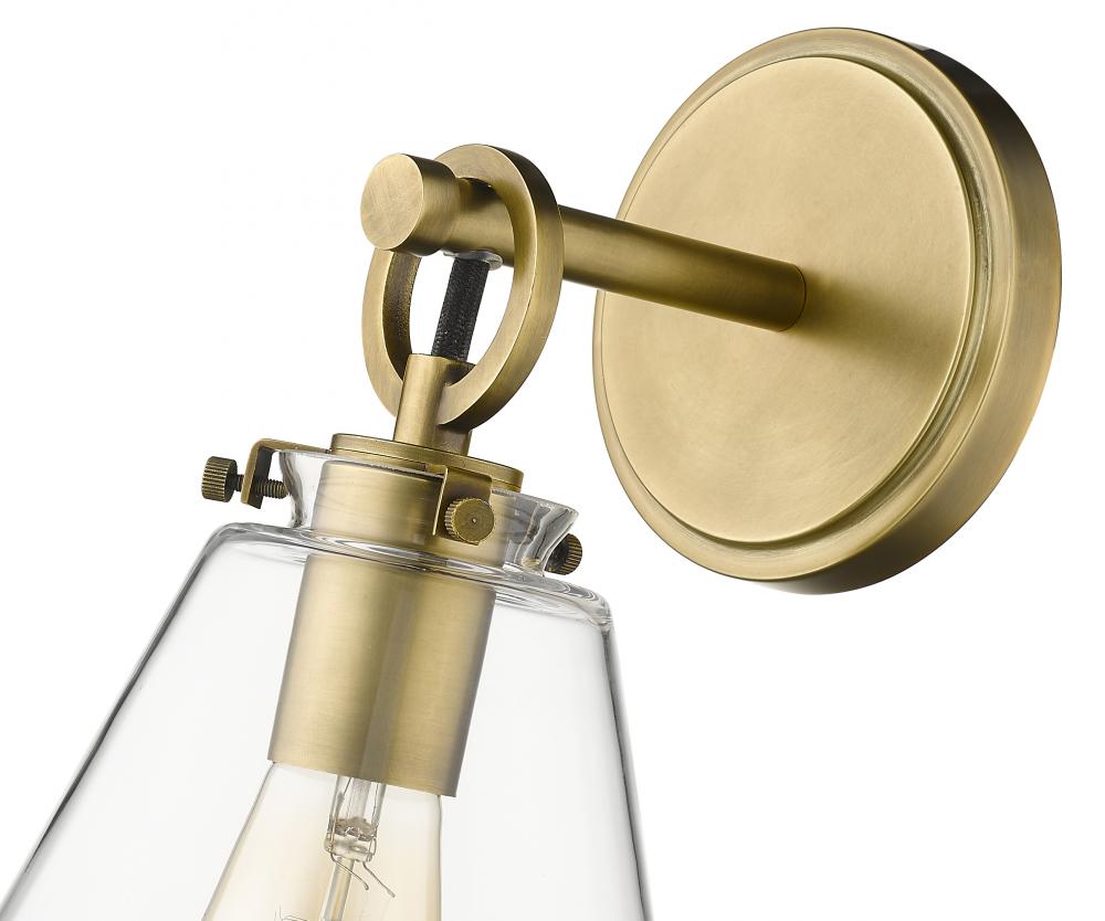 This contemporary one-light wall sconce devotes attention to detail as it delivers fresh, inspiring materials. Make a modern bathroom, bedroom, or hallway come to life with a fixture featuring rubbed brass finish steel and a conical clear glass shade.