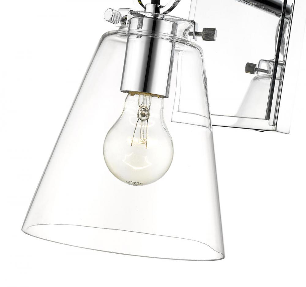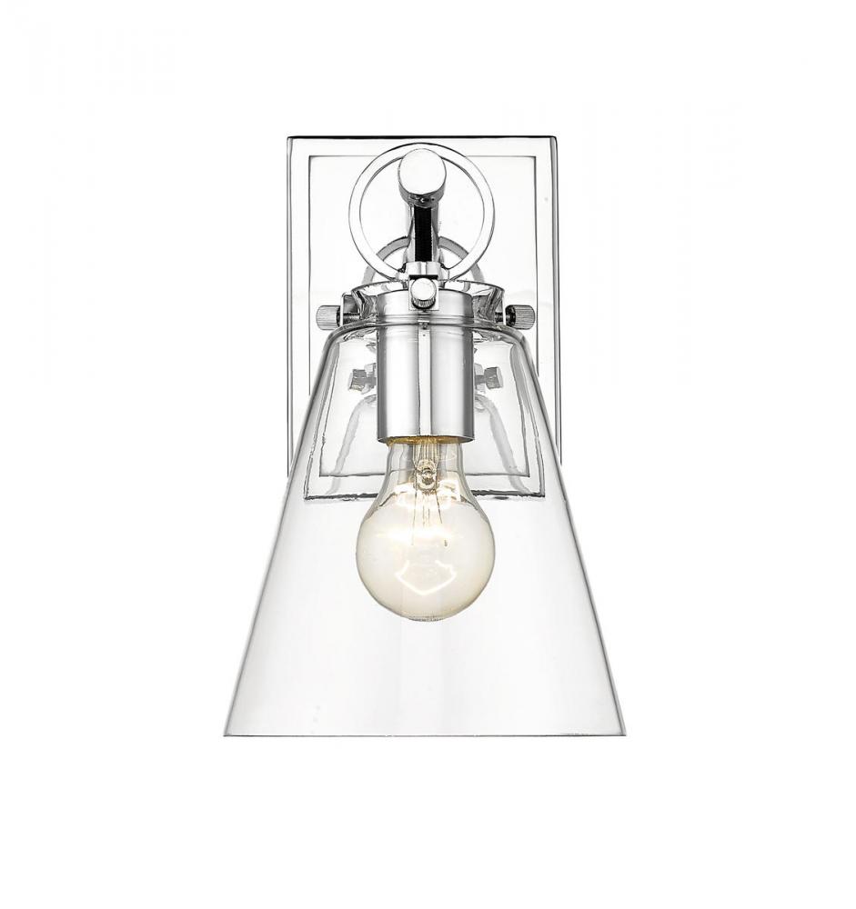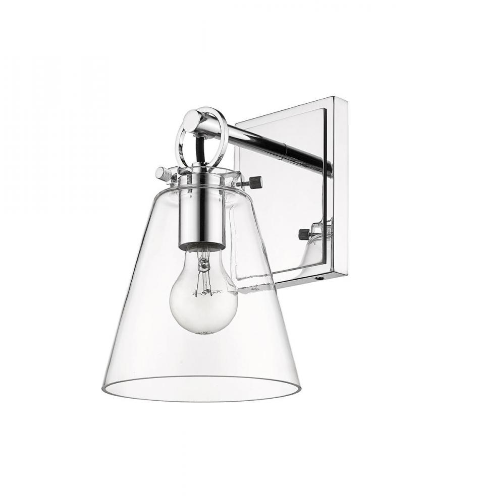 Contemporary bathrooms light up with the chic, delicate design of this one-light wall sconce. With a conical shade crafted of clear glass, it adds a charming motif with a shiny chrome finish hand-tooled steel mount adding festive geometric accents. This light from the Harper collection dazzles in a custom bath space.