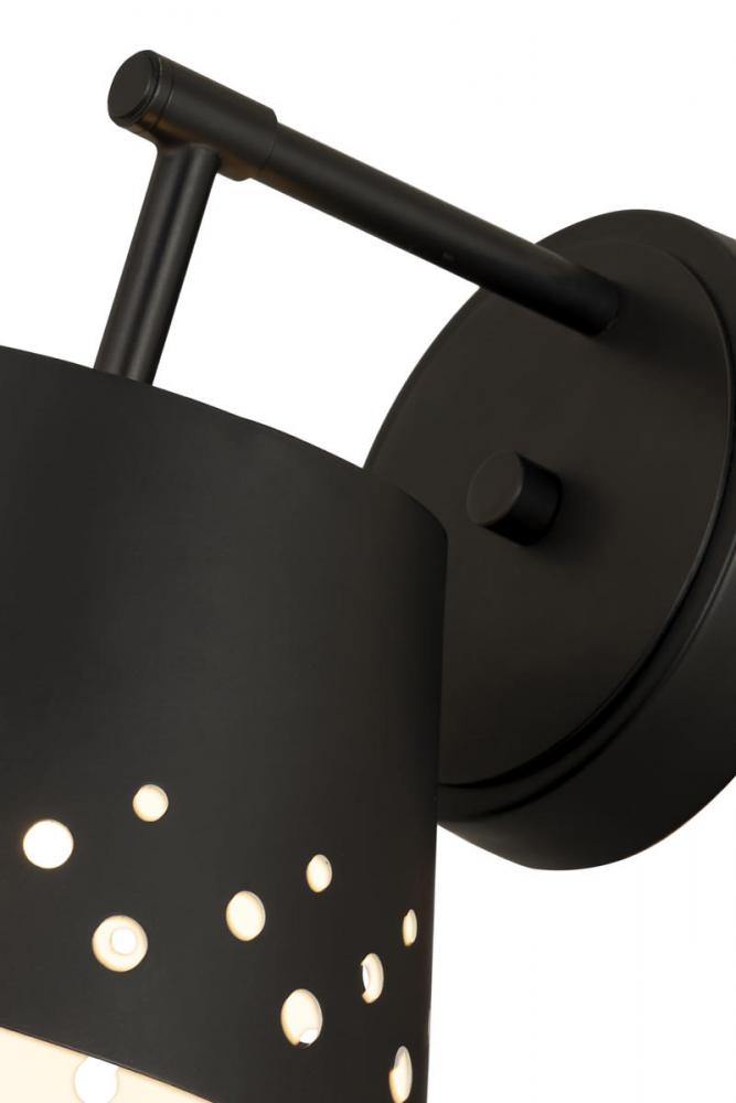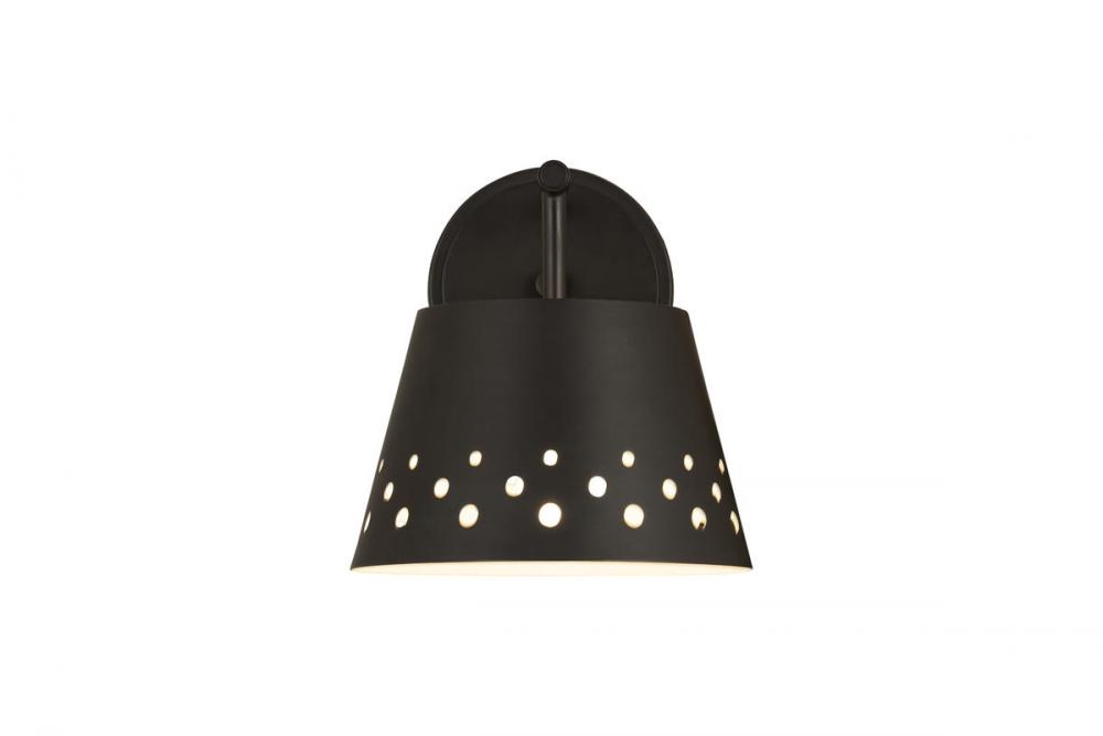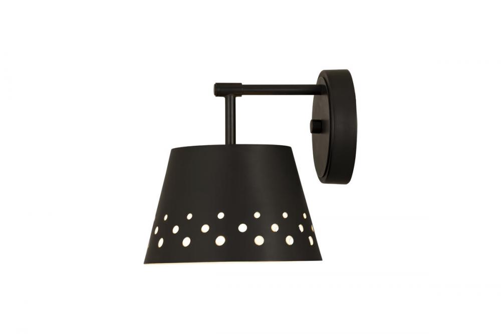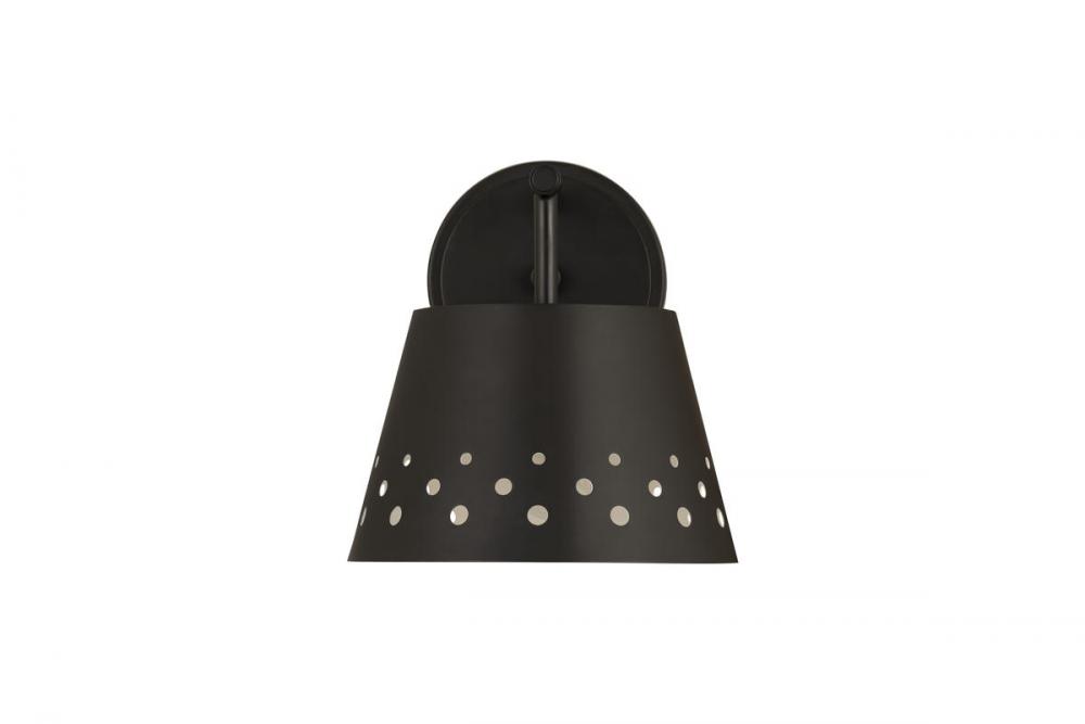 A striking look of sophistication sneaks in whimsical charm when this one-light wall sconce brings festive vibes to any casual space. This sconce from the Katie collection delivers an upbeat flavor with its bold matte black finish iron construction and novel circular cutouts that add character as they let light shine through.