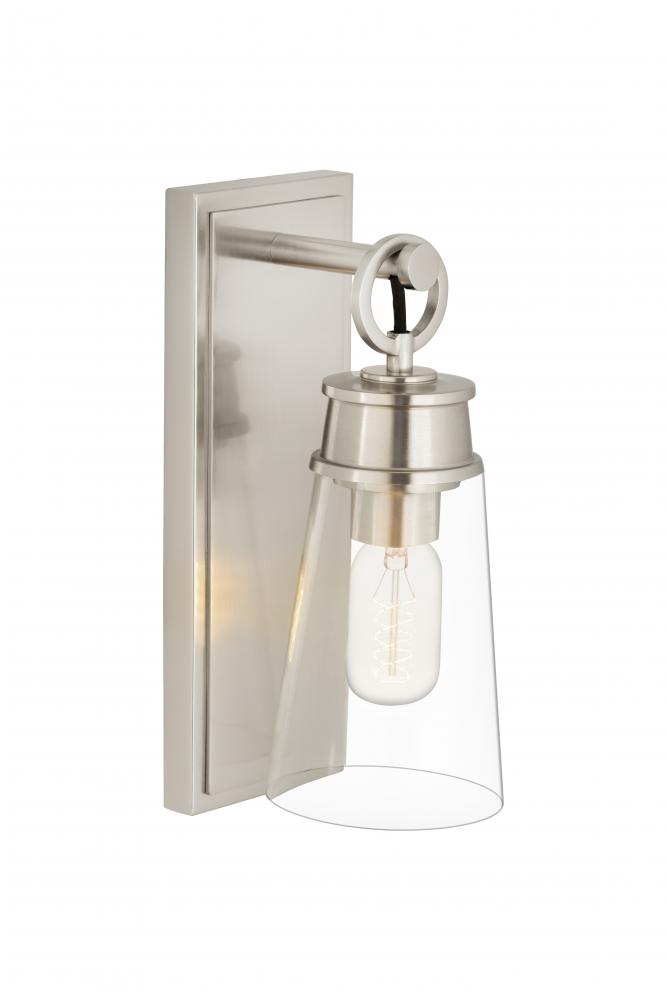 Fusing romantic, contemporary aesthetics, the Wentworth single-light wall sconce brings indulgent elegance in conjunction with welcomed accent lighting and a hint of nautical style. Dress up a classic modern space with a carefully designed fixture featuring a sparkling clear glass conical shade and a collection of accents fashioned of polished nickel finish metal.