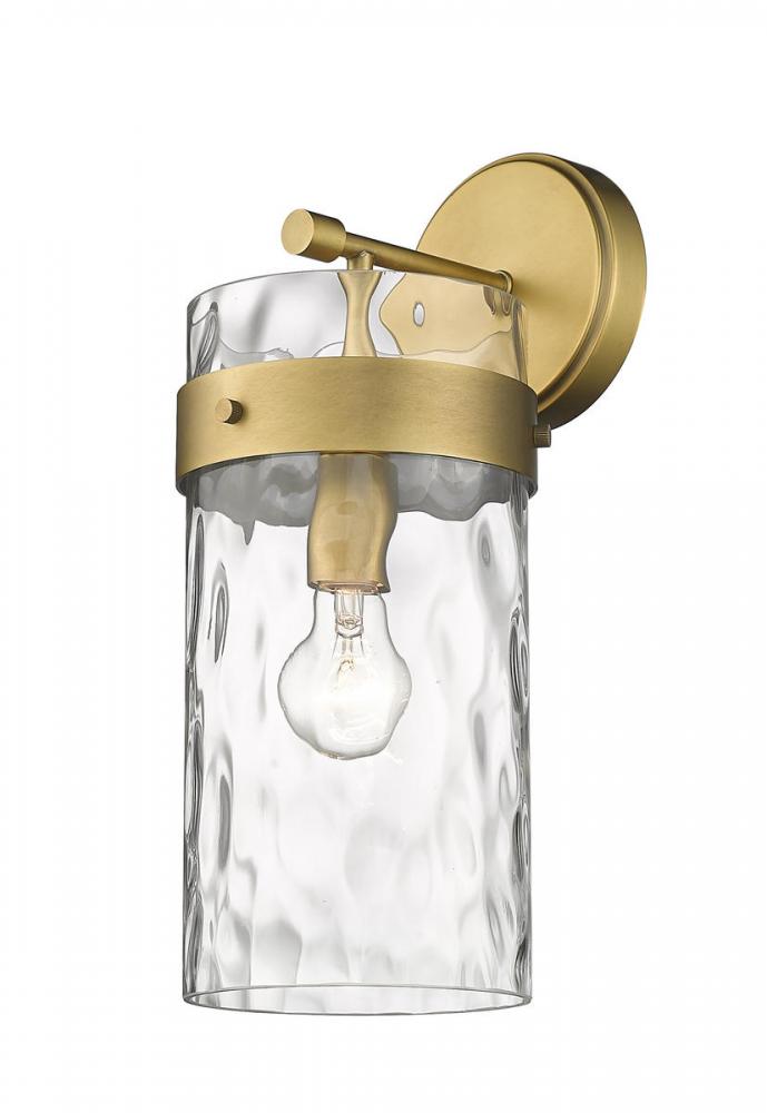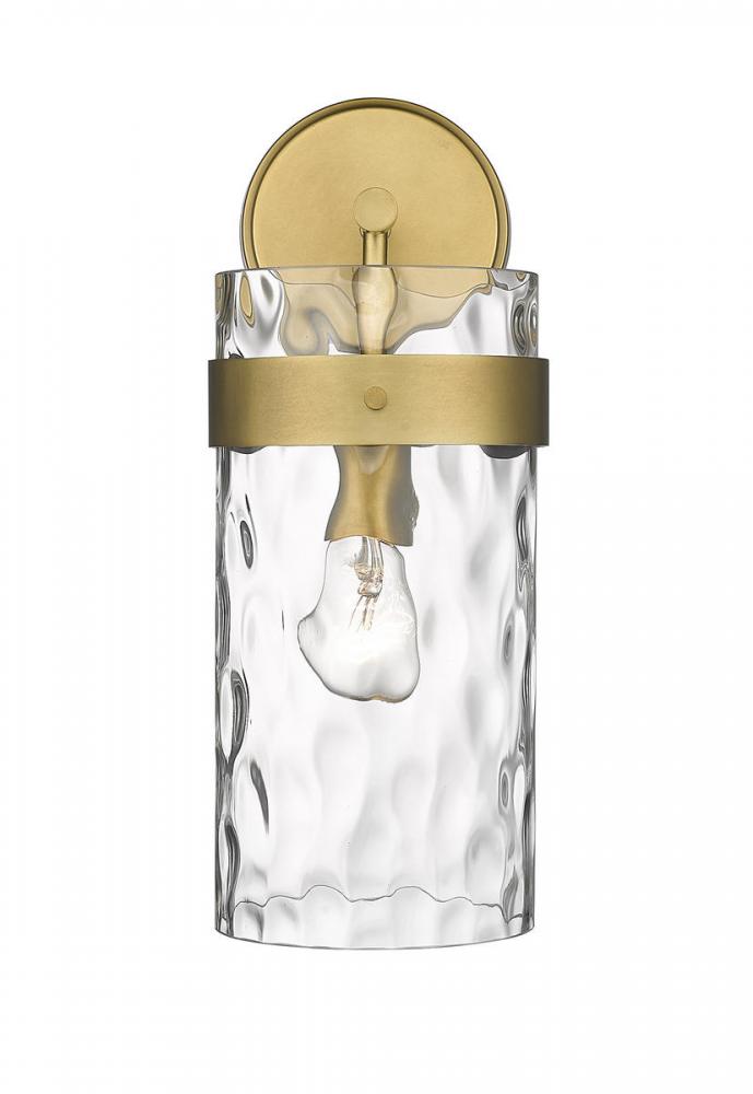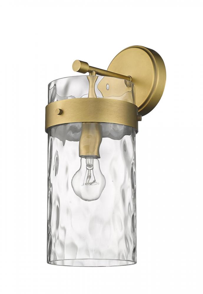 Illuminate dark hallways and bathrooms with this wall sconce. This fixture flaunts a cylindrical glass shade with a romantic ripple texture. Steel construction is enhanced with a rubbed brass finish.