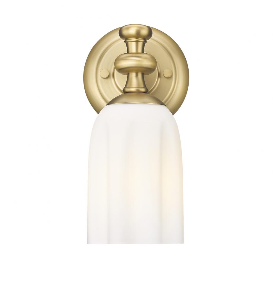 Step up the stylish presentation of your lighting with a modern one-light wall sconce. Pairing a modern gold finish and decorative flourishes, its the perfect choice for a refined living space, bedroom, or bath, creating a hint of vintage romance and charm with scalloped glass and its eye-catching arm and wall plate. Opal etched glass shades the light and ensures a soft, inviting look and feel.