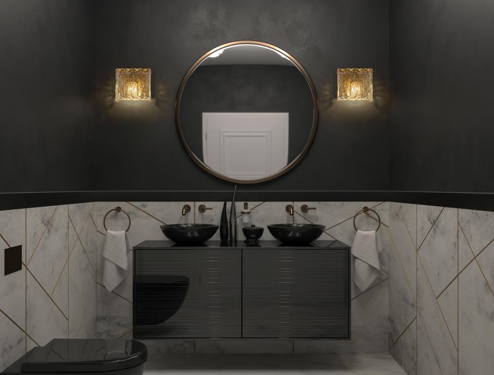 The warmth of a modern gold finish steel framework is the perfect enhancement for this modern one-light wall sconce. Icy panels of textured clear glass create impeccable texture and depth, perfect for complementing a cool, sleek vanity, hall, or kitchen.