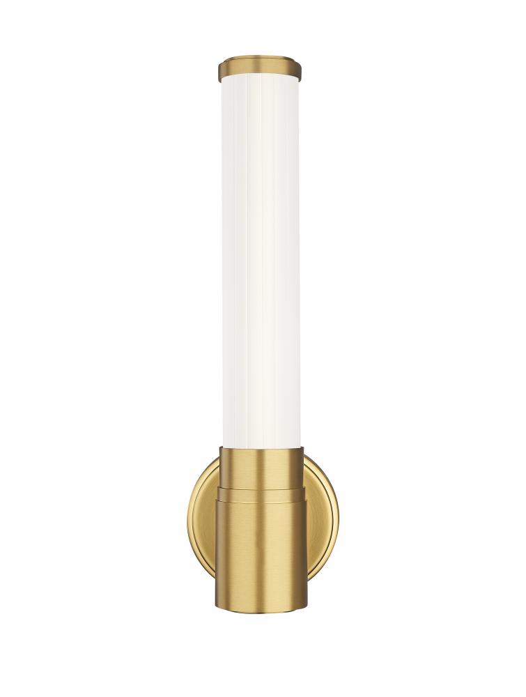 Take your lighting ensemble to stylish new heights with this modern LED wall sconce. Its modern gold finish is warm and rich, highlighting a steel frame with a stepped collar and round wall plate. Its minimalist silhouette is enhanced with a vertical cylinder of ribbed opal glass, offering the perfect complement to its dimmable, energy efficient LED light.