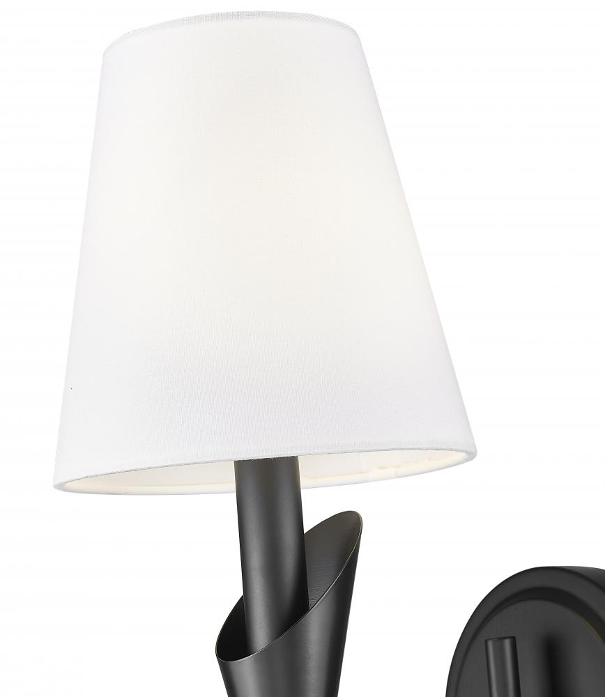 Where simplicity meets fluid design, this sconce brings a poetic silhouette to the everyday. Its slim matte black arm arcs gracefully under a white fabric shade, adding a gentle curve to any vertical space. Perfect for modern or transitional settings, it?s a small fixture with big design presence.