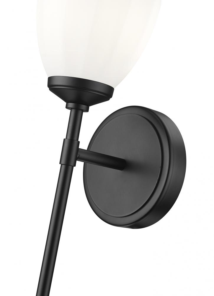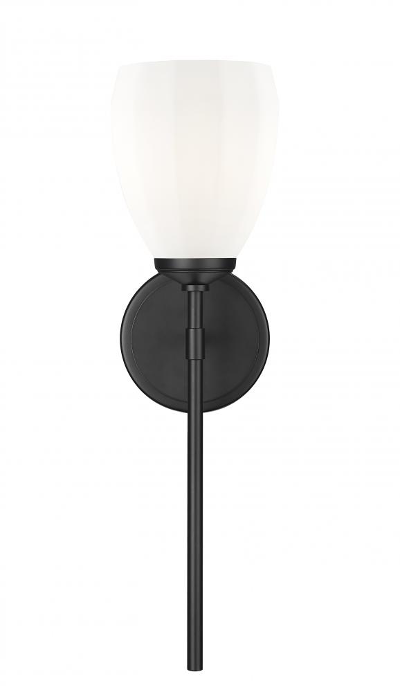 Richness and delicacy coexist beautifully in this modern one-light wall sconce. In matte black, it showcases a slim stem that hosts delicately faceted matte opal glass that casts inviting illumination and ambiance. An oval wall plate adds distinction in a powder room or over a freestanding tub.