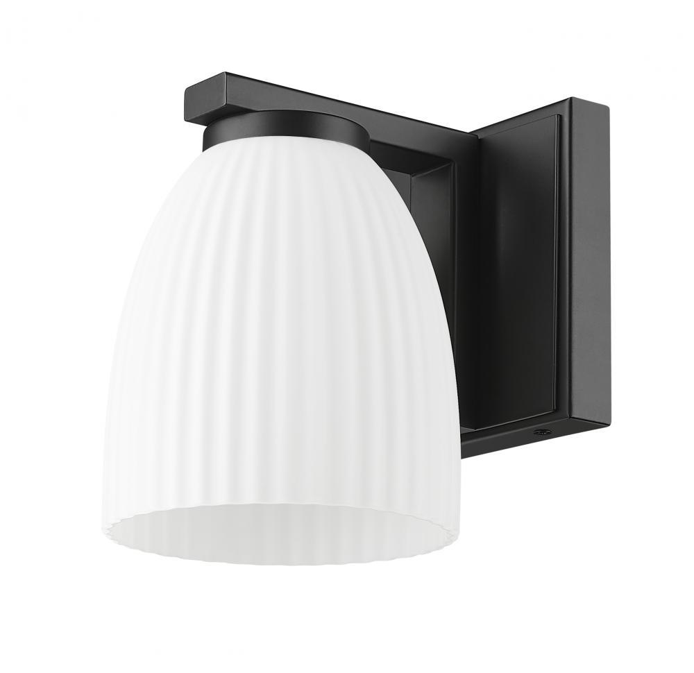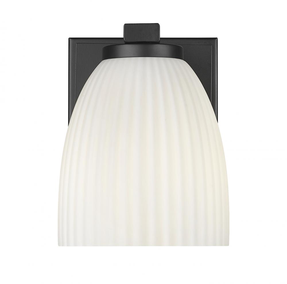 Sharp lines meet soft glow in this matte black wall sconce designed to elevate modern interiors. A matte opal glass shade diffuses the light with a ribbed texture that feels quietly refined. It?s a subtle accent that delivers effortless sophistication.
