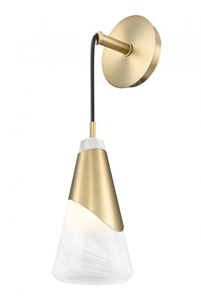 Juxtaposing the warmth a modern gold finish and the icy elegance of swirling artisanal glass creates captivating style. This modern one-light wall sconce enchants with the soothing curves and luscious finishes, creating a daring focal point in a bath, entry, or living room.