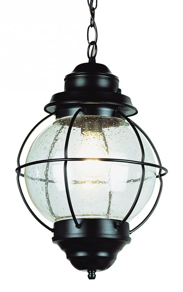 The Catalina Collection brings suspended décor to an outdoor area with a hanging lantern. The Catalina 19" Hanging Lantern brings unobtrusive lighting to any outdoor living area while boasting an eye-catching design. A round clear Seeded glass shade embodies classic styling of nautical lighting. This quality outdoor onion lantern features a single down light and clear seeded glass that is encased by a cage frame.