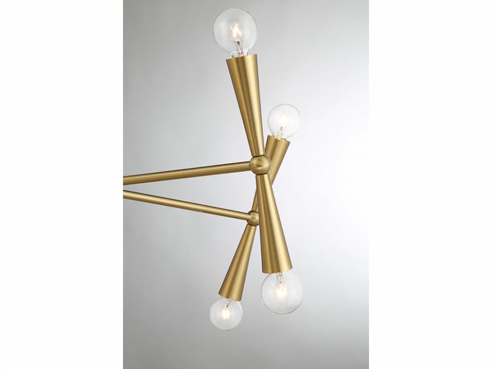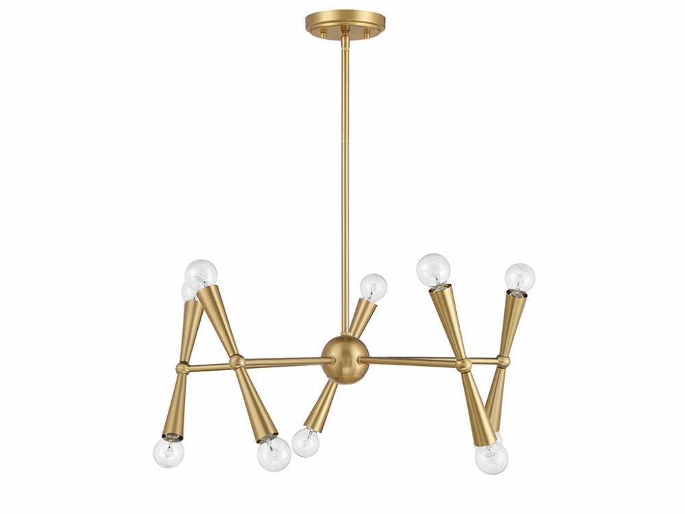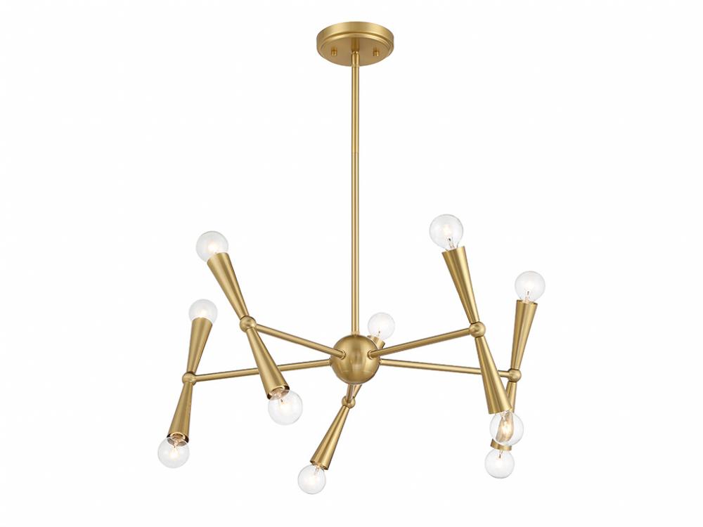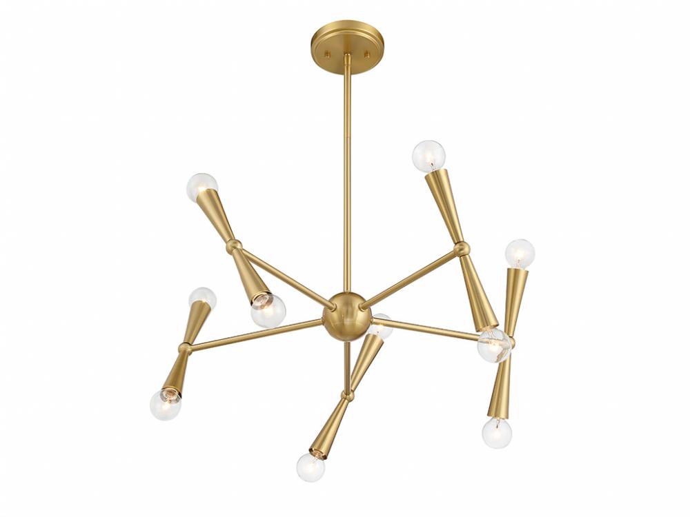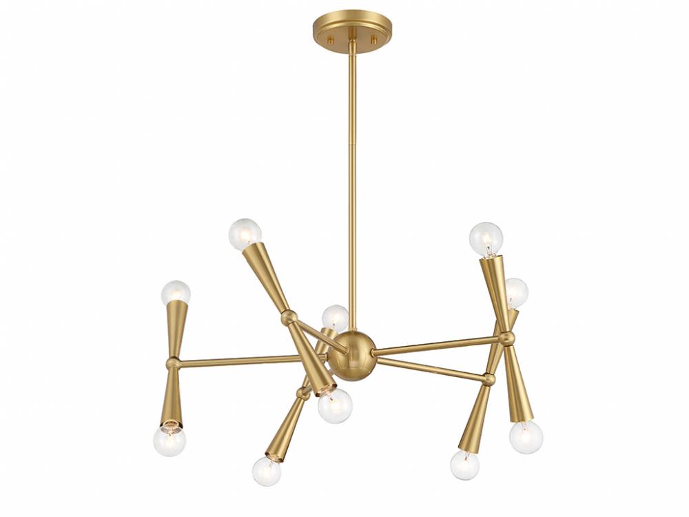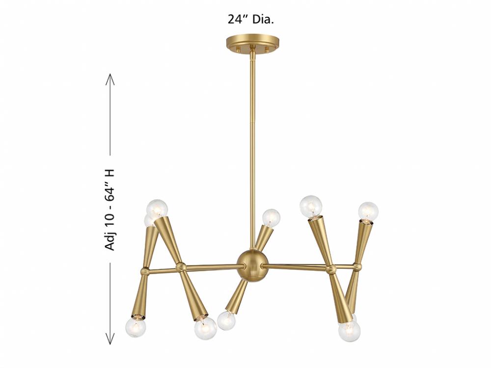 Make a scene with the unique silhouette of this 10-light chandelier! Cone-shaped arms finished in Natural Brass burst forth from the center, jutting out at jaunty angles and bearing bare bulbs to let the light shine brightly. This chandelier is 24" in width and has an adjustable height ranging from 10" to 64". Comes with four 12" downrods and one 6" downrod. Uses 10 candelabra size bulbs of up to 60 watts per bulb. We recommend using globe-shaped bulbs for heightened appeal. Bulbs not included.