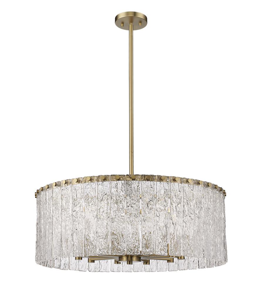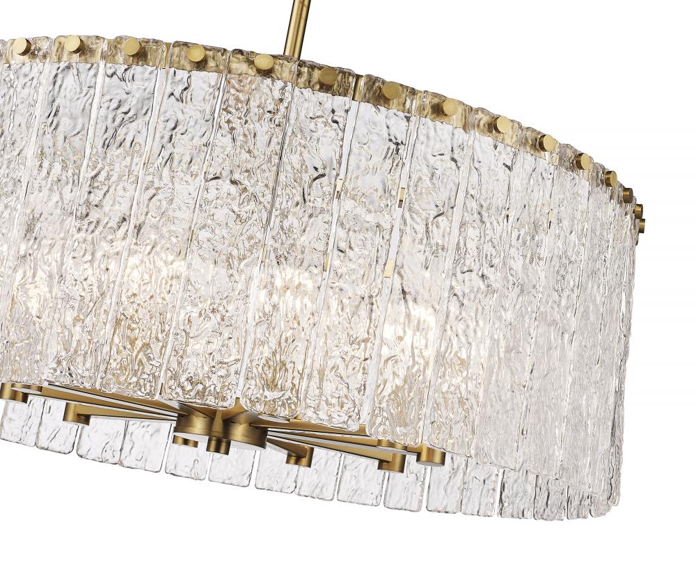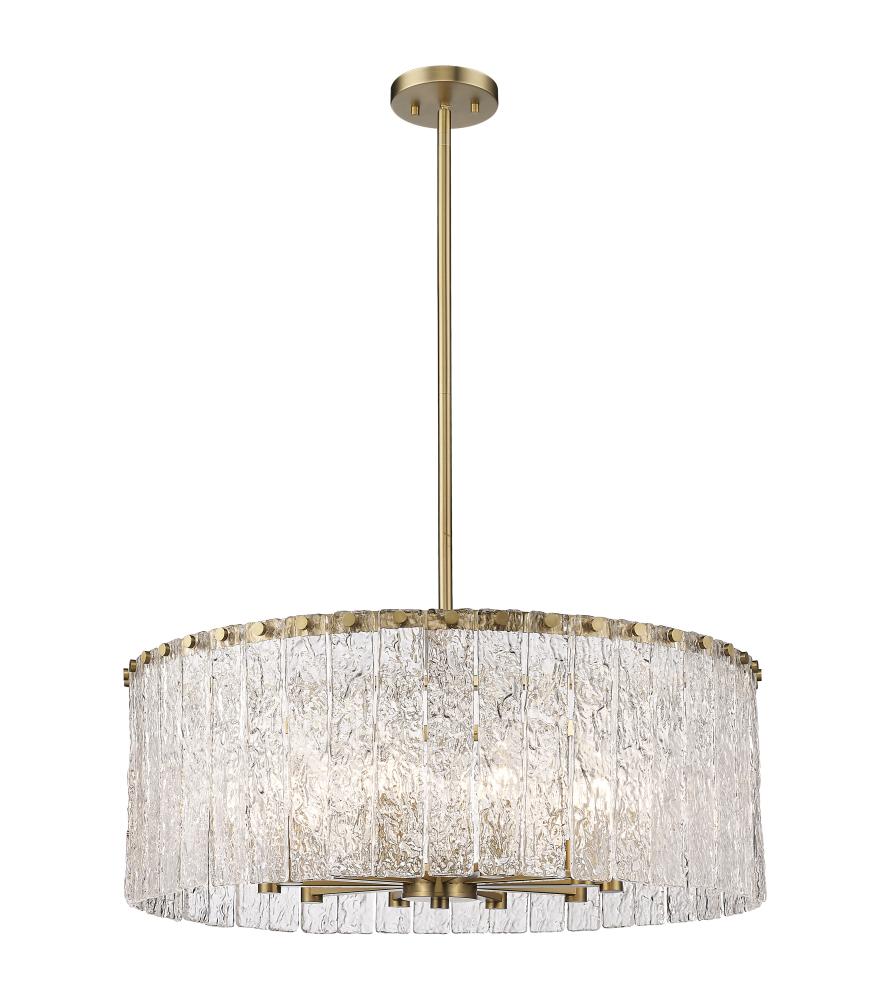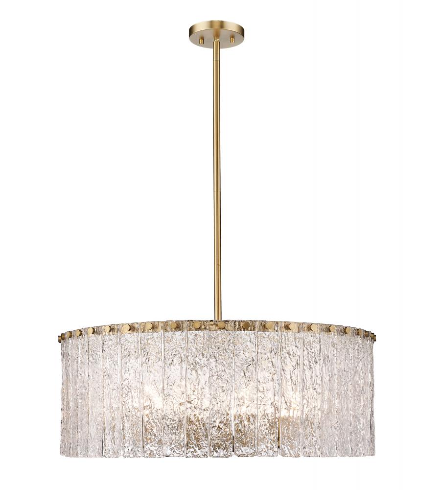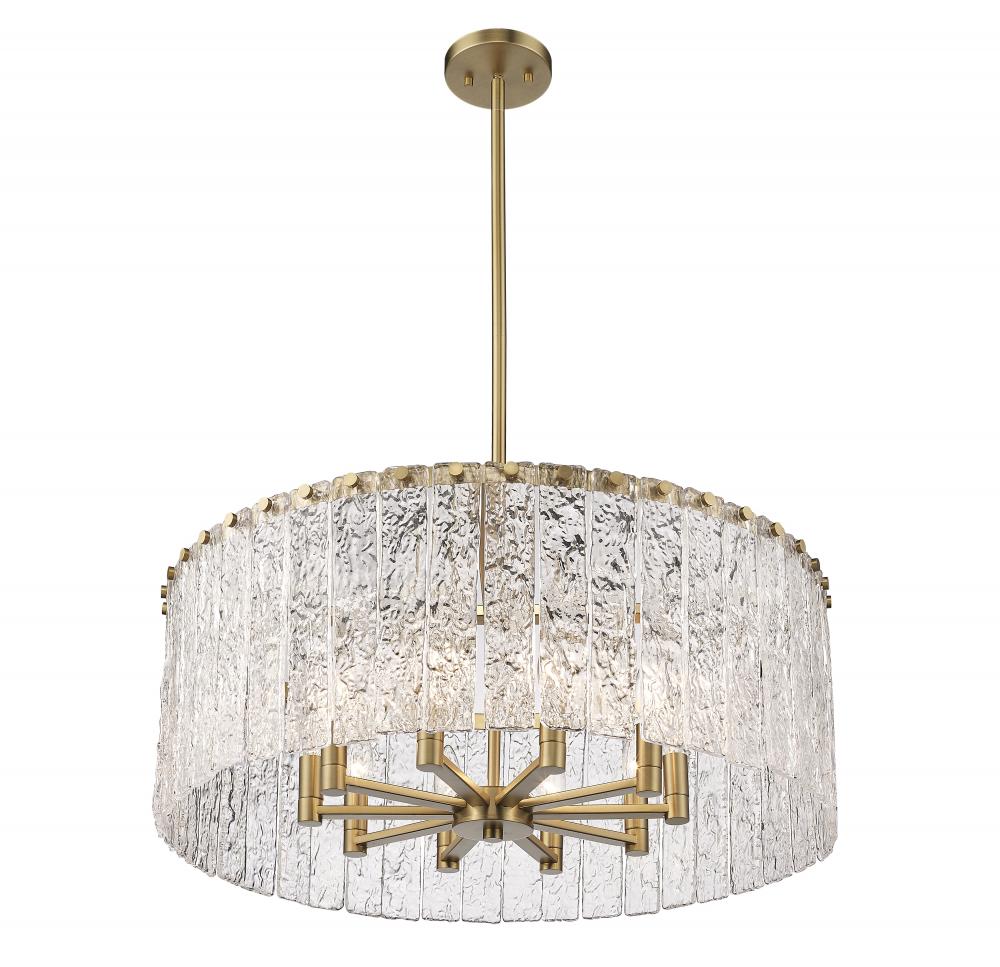 An inspired blend of old and new plays out in the artful impact of this extraordinary light fixture. The Glacier round ten-light pendant features clear textured glass panels that emulate melting ice, an incomparable effect with dramatic impact in a foyer, dining room, or main living area. Modern gold finish steel is placed as a crown frame, adding a consistency in palette and motif and embellishing with a blend of glam and industrial ambiance.