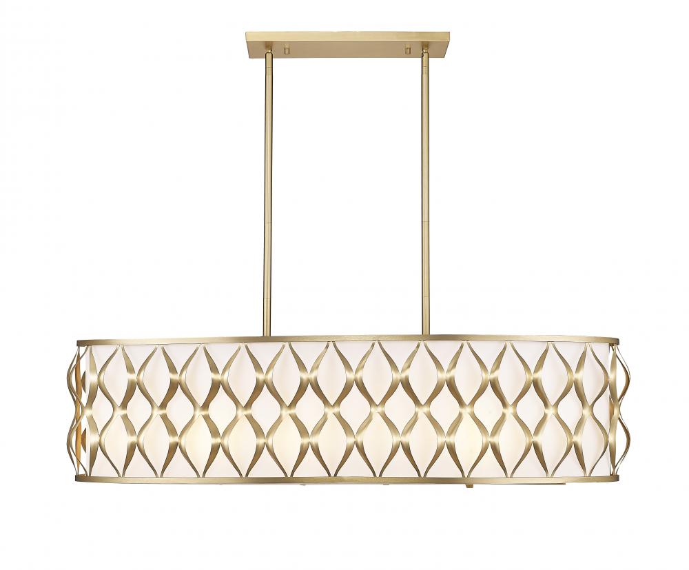 Classic styling delivers both modern industrial and transitional elegance to any space as this ten-light linear chandelier makes an artisan impact over kitchen islands, dining spaces, and billiards rooms. With a wavy ribbon pattern on its modern gold finish steel frame and a white fabric diffuser, this stylish fixture maintains palette simplicity and offers a versatile look. Candelabra lights are gently filtered to manage glare levels, emitting an optical glow that?s easy on the eyes..