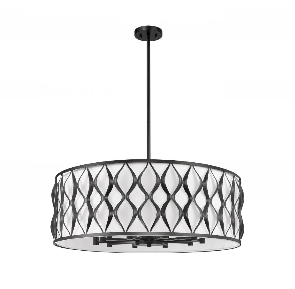 Romantic style details embellish this transitional ten-light pendant delivering timeless beauty and construction of bold matte black finish steel. A drum silhouette is aesthetically pleasing as this fixture offers artisan ribbon waves cascading vertically down its banded frame, and a soft white fabric diffuser maintains pleasing lighting effects. Candelabra-style lights and a round canopy complete a checklist of features that round out an iconic look in a pendant that adds elegance to kitchens, foyers, and dining spaces.