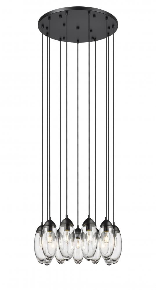 The intimately elegant effect of glasswork adds gleaming radiance to this glam 11-light chandelier. Illumination bounces off of cascading organic teardrop glass shades scattered to offer an abstract silhouette. With a tasteful round matte black finish metal canopy, room or entryway customization becomes a key factor.