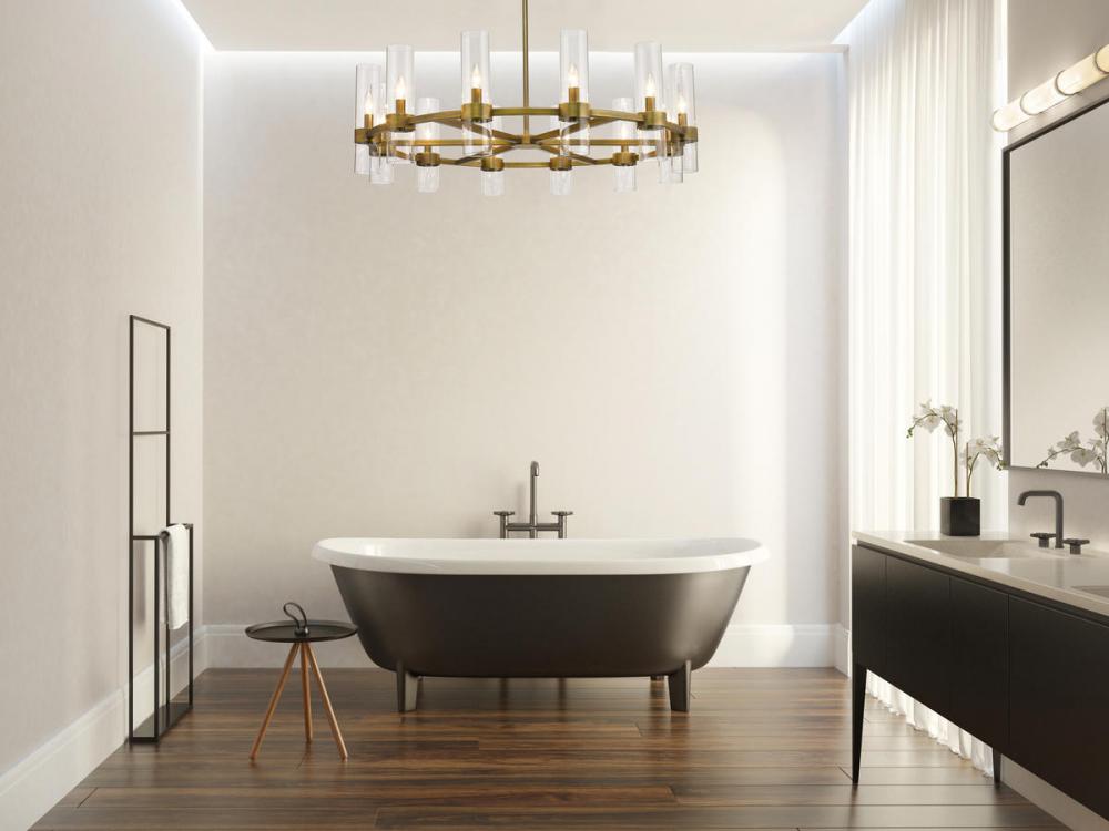 This contemporary twelve-light chandelier from the Datus collection features a slick round silhouette and a sense of simple elegance. Illuminate a foyer, dining area, or main living space with this circular-inspired chandelier featuring solid iron with a warm rubbed brass finish and delicate clear glass cylinders.