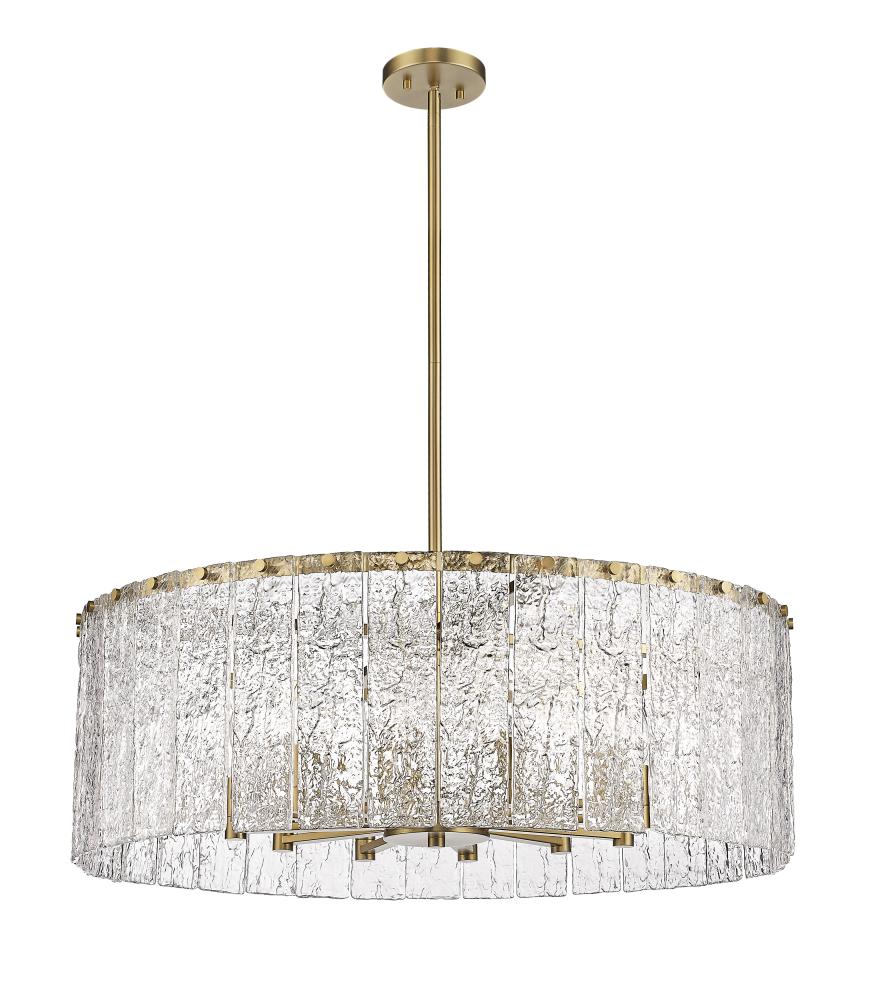 Choose gallery inspiration with a touch of minimal industrial artistry in a fixture that becomes a focal point. The Glacier round twelve-light pendant features clear textured glass panels that emulate melting ice, an incomparable effect with dramatic impact in a foyer, dining room, or main living area. Modern gold finish steel is placed as a crown frame, adding a consistency in palette and motif and embellishing a sought-after custom motif.