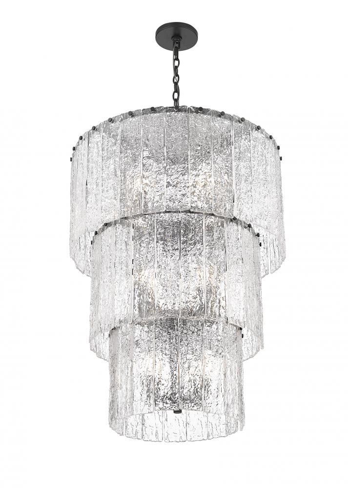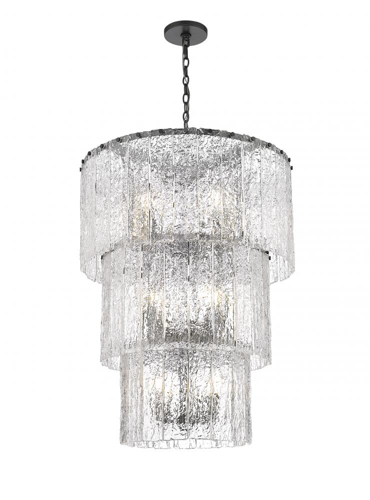 Three tiers of icy clear glass create depth and impressive artistry for this modern 12-light chandelier. Its durable steel frame receives a matte black finish, creating depth and contrast over a foyer or in your dining room. This chandelier is a true statement piece, offering refined sophistication and elegance.