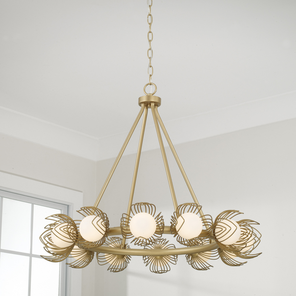Romantic and artful, the Flora Medium Chandelier exudes botanical charm in a classic ring silhouette. Soft White glass globes are enveloped by a florla motif of delicate bent wire petals, finished in our signature Buffed Gold to bring a vibrant, warm hue to this showstopping style.