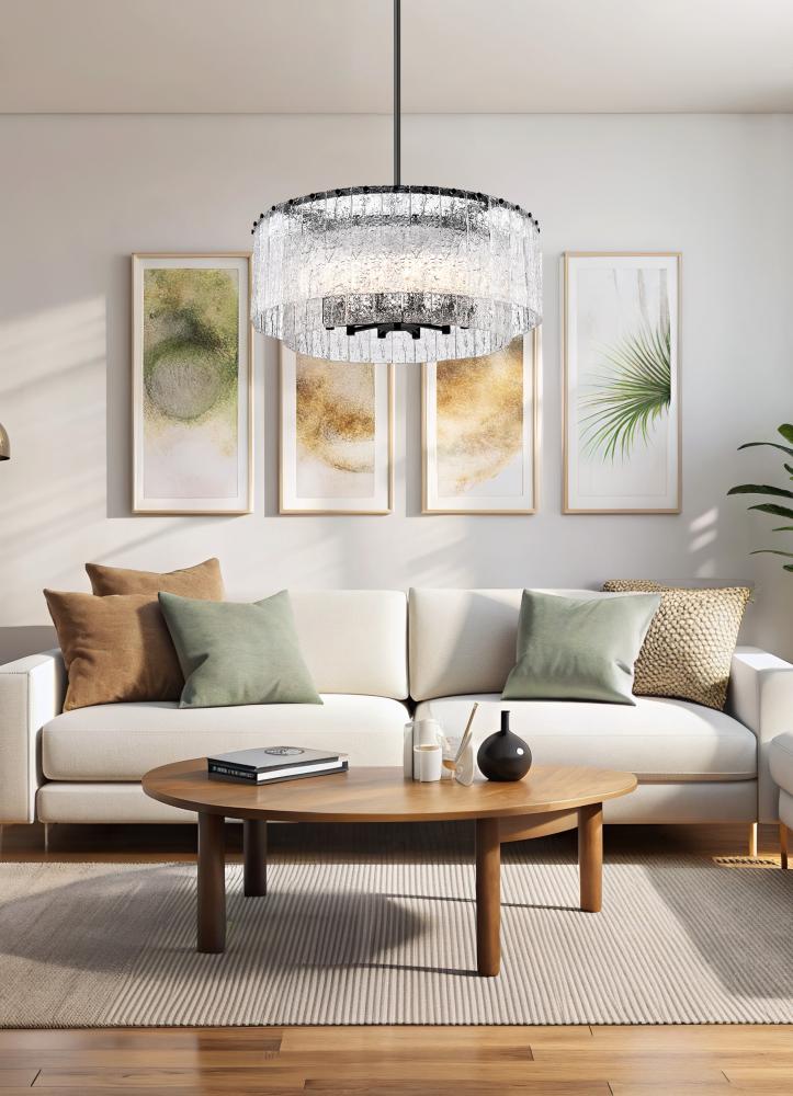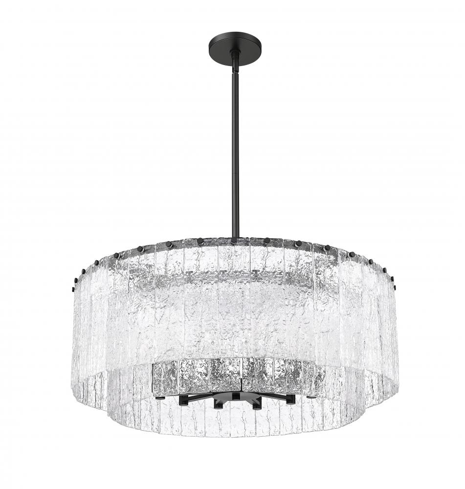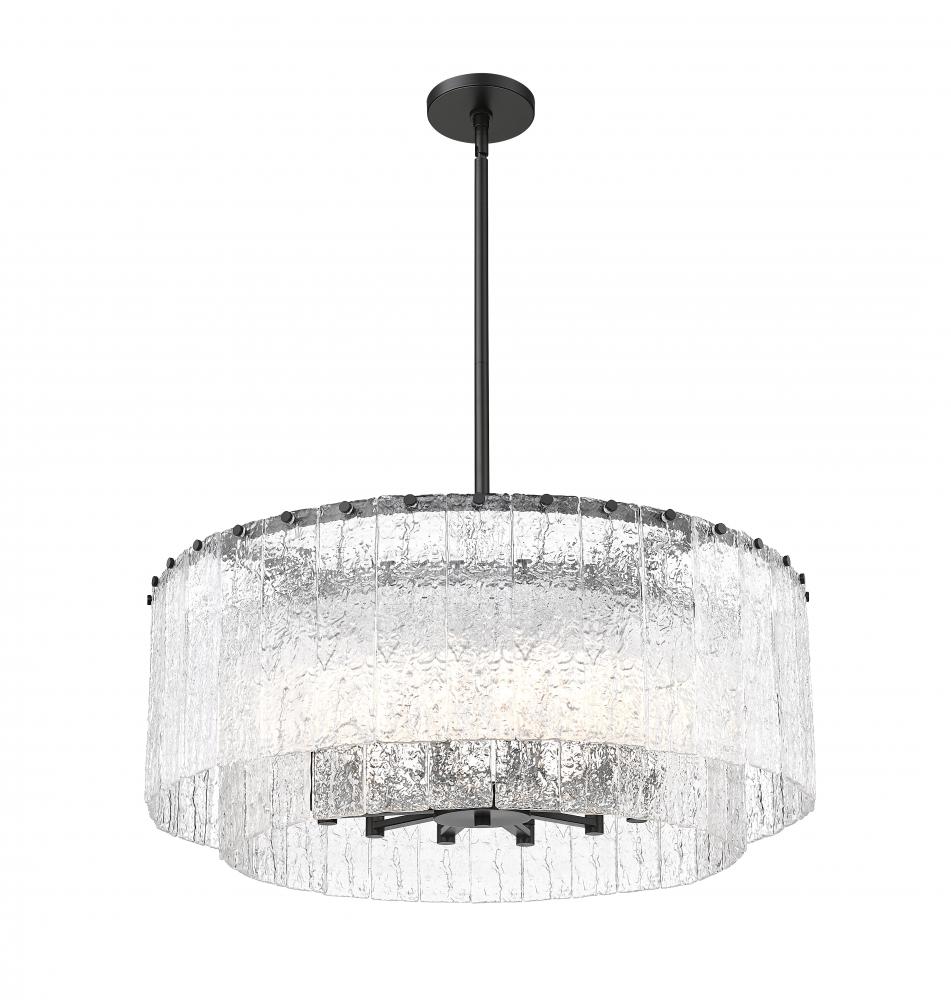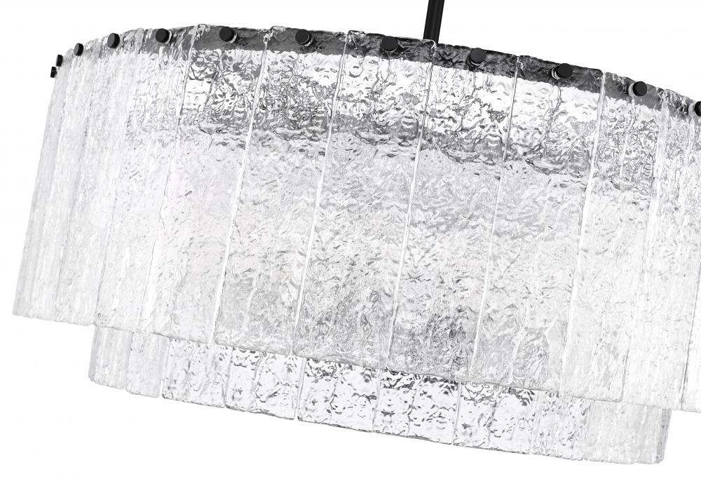 Two tiers and a round silhouette pair with exquisite finishes in this modern 12-light pendant. A contemporary masterpiece, it imparts stunning sophistication, perfect for a dining room, foyer, or bedroom. Its minimalist steel frame features a crisp matte black finish, instilling a sense of contrast and depth. Vertical panels of clear textured glass evoke melting ice, adding incredible sophistication in your home.