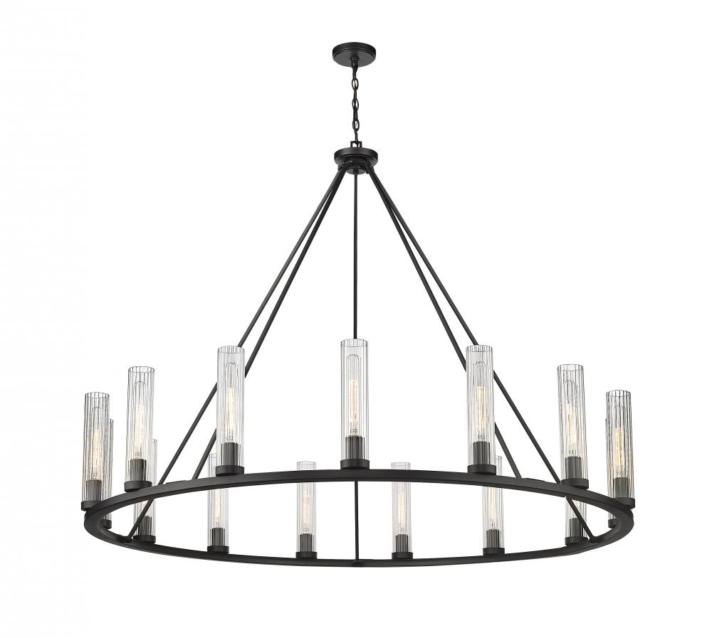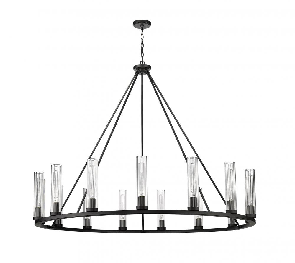 Indulgent castle-inspired vibes bring a delightfully bold look in the Beau fifteen-light chandelier, a captivating choice for highlighting kitchen islands and dining spaces. Transitional in motif, this circular fixture suggests industrial aesthetics with a cool bronze finish steel frame dotted with slender tube shades fashioned of fluted glass.