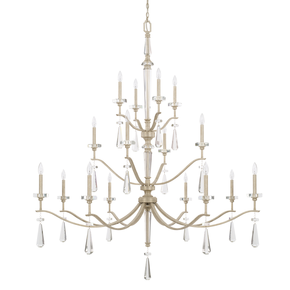 Featuring tiered lamping, faceted K9 crystal fluting, cut-crystal teardrops and a regal Winter White finish, the Serena 16-light chandelier makes a spectacular focal point. Ideal as a living room or dining room chandelier for formal and semi-formal settings, this light fixture embodies a hint of Parisian flair with elegant, transitional styling.