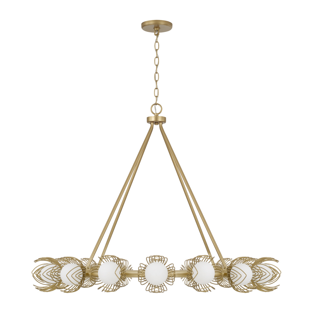 Romantic and artful, the Flora Large Chandelier exudes botanical charm in a classic ring silhouette. Soft White glass globes are enveloped by a floral motif of delicate bent wire petals, finished in our signature Buffed Gold to bring a vibrant, warm hue to this showstopping style.