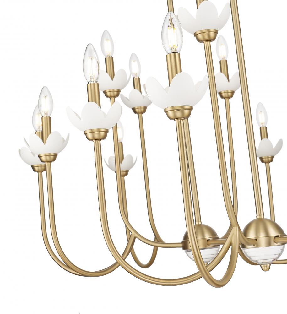 Capture a vintage inspired vibe with this transitional 16-light linear chandelier in striking modern gold finishing. Its multi-tiered steel frame is adorned with floral bobeches, offered in interchangeable white metal and clear glass, which create a chic, feminine touch that evokes a bygone era. Glass spheres complete the look and offer subtle radiance over your living or dining room.
