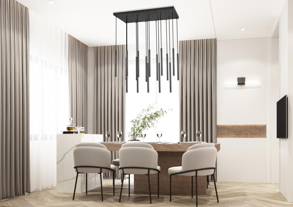 Encourage sophistication in a modern space with this contemporary 17-light chandelier with a linear profile. Great over a dining table, it features a matte black finish with matching black braided cords that suspend slim lights, each with integrated LEDs that are dimmable and energy efficient for excellent performance in any room.