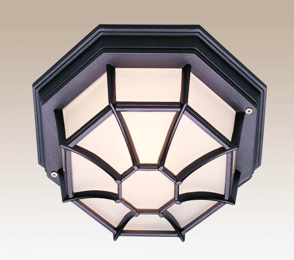 The Benkert Collection is a low-profile style designed to cast a soft ambient light over a wide area. The distinct shape blends with any decor , while also illuminating a variety of outdoor living areas. The prominent web-like metal housing is an octagonal shape. The Benkert 5" Flushmount Lantern accepts a single light, has frosted glass panels and is offered in multiple finish choices.