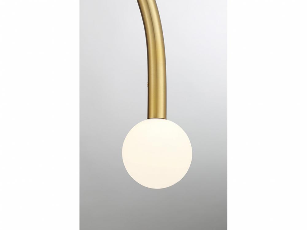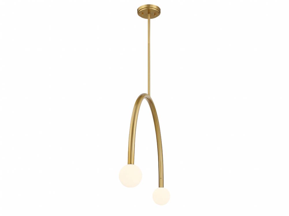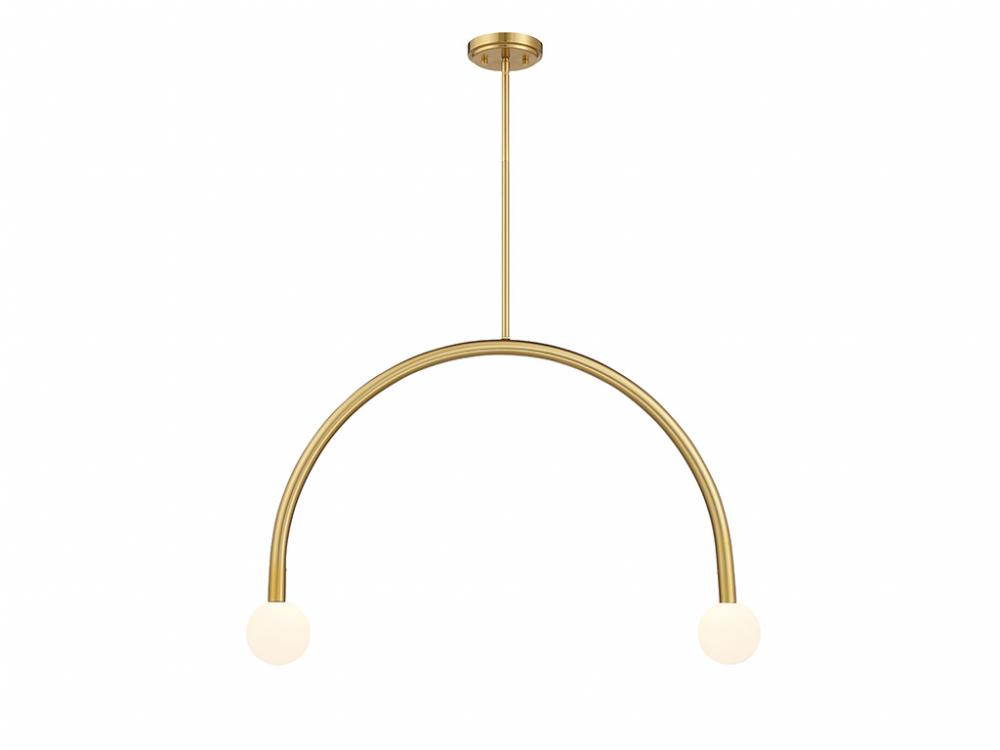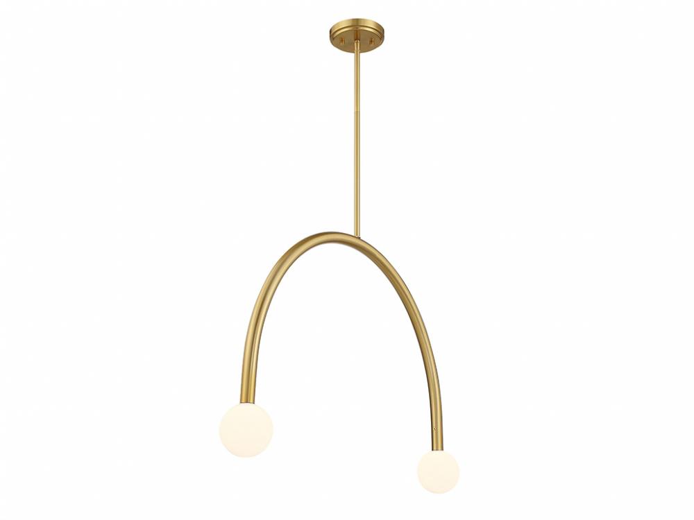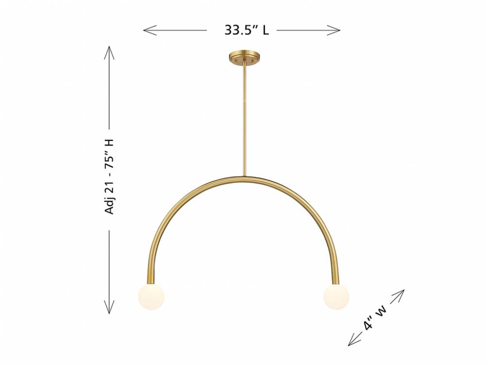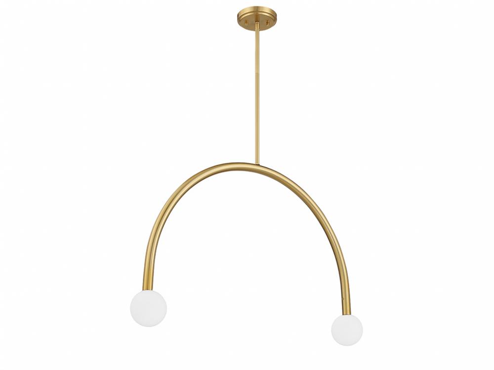 This perky, peppy 2-light chandelier has a curving style that makes a big impact! The light shines from inside orbs of white opal glass and the Natural Brass finish works beautifully with any decor. This chandelier is 33.5" in length, 4" in width and has an adjustable height ranging from 21" to 75". It comes with four 12" downrods and one 6" downrod. Uses two G9 LED bulbs of up to 3.5 watts per bulb. Bulbs not included.