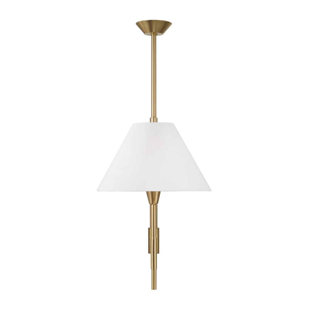 DETAILS: Bold lines and angular White fabric shades bring a structured, sculptural feel to the classic silhouette, punctuated by tapered socket details and the brushed shine of the Aged Brass finish.