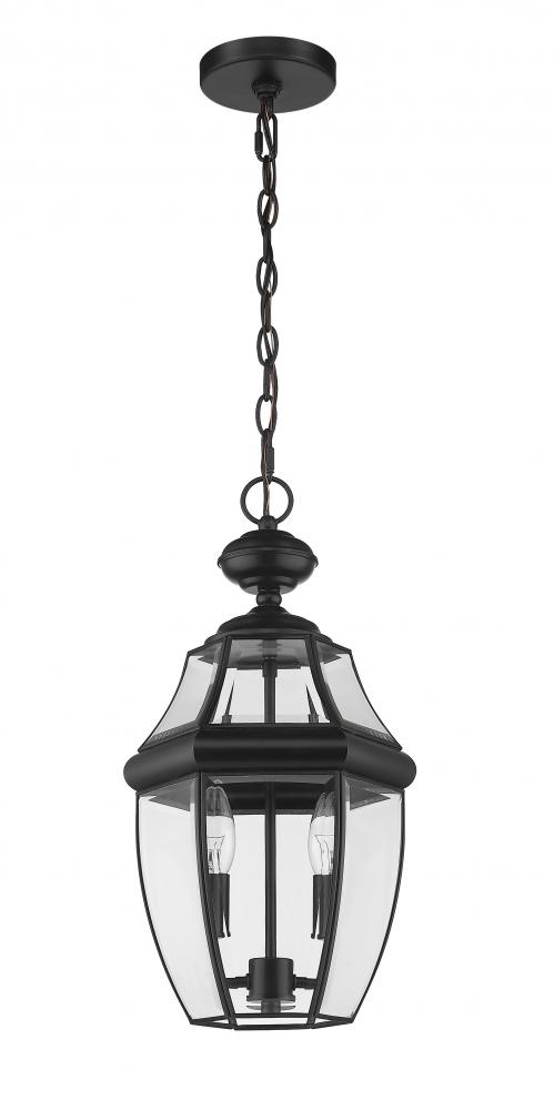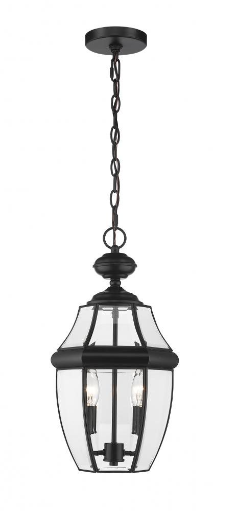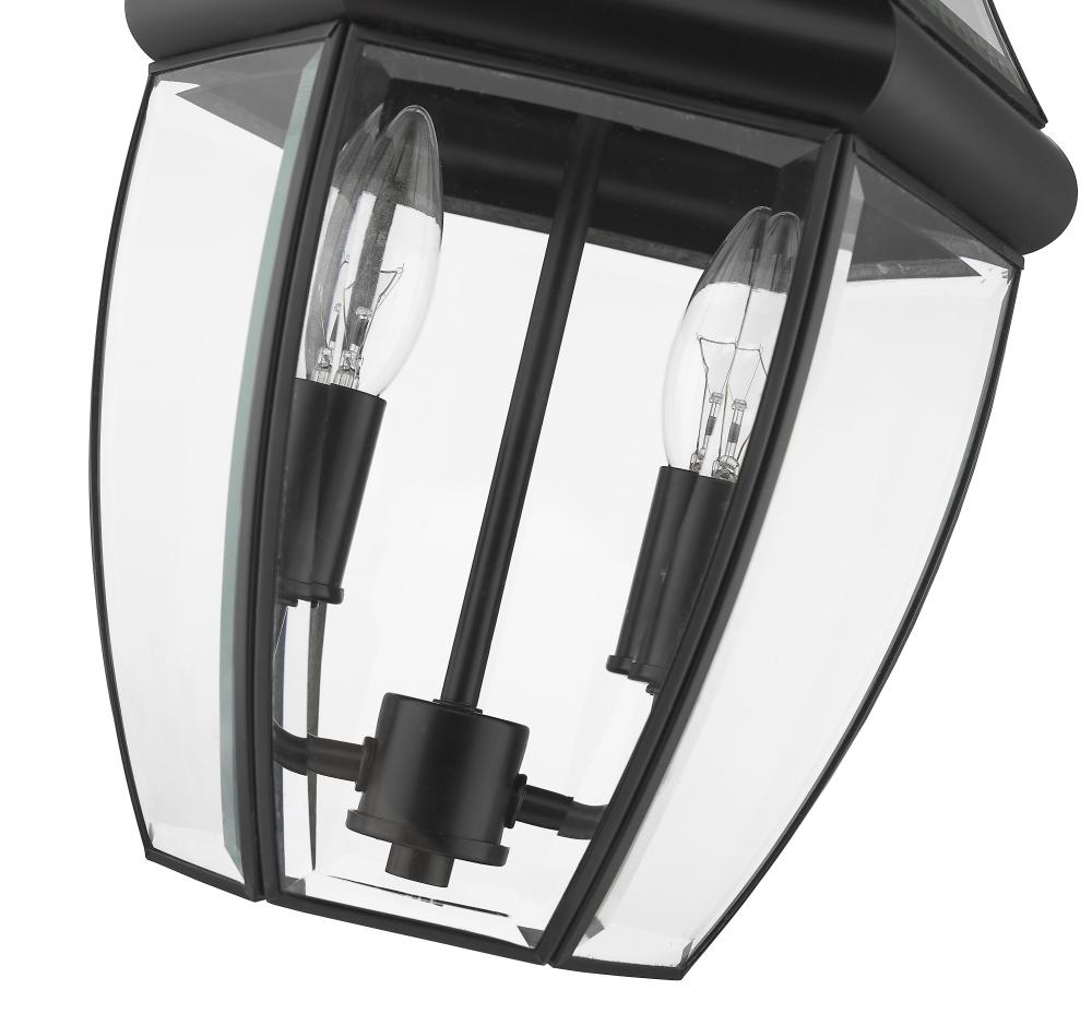 This two-light outdoor chain mount ceiling fixture adds a classic silhouette to the lighting in your patio, deck or porch area. With its candelabra composition, the lamp provides soft, effective illumination. A multi-sided clear beveled glass shade has a black steel frame, creating an elegant impression.