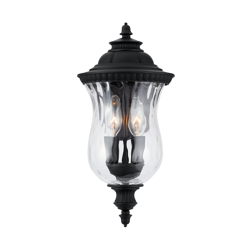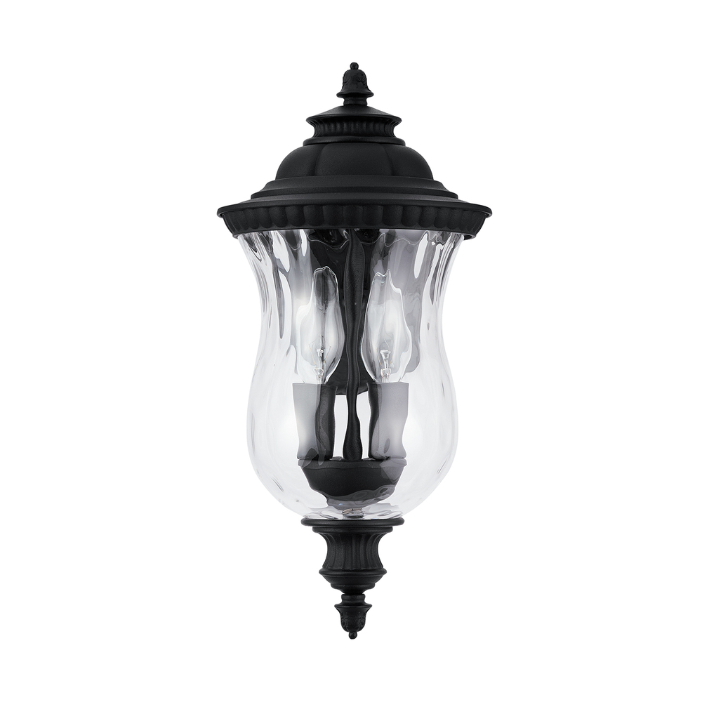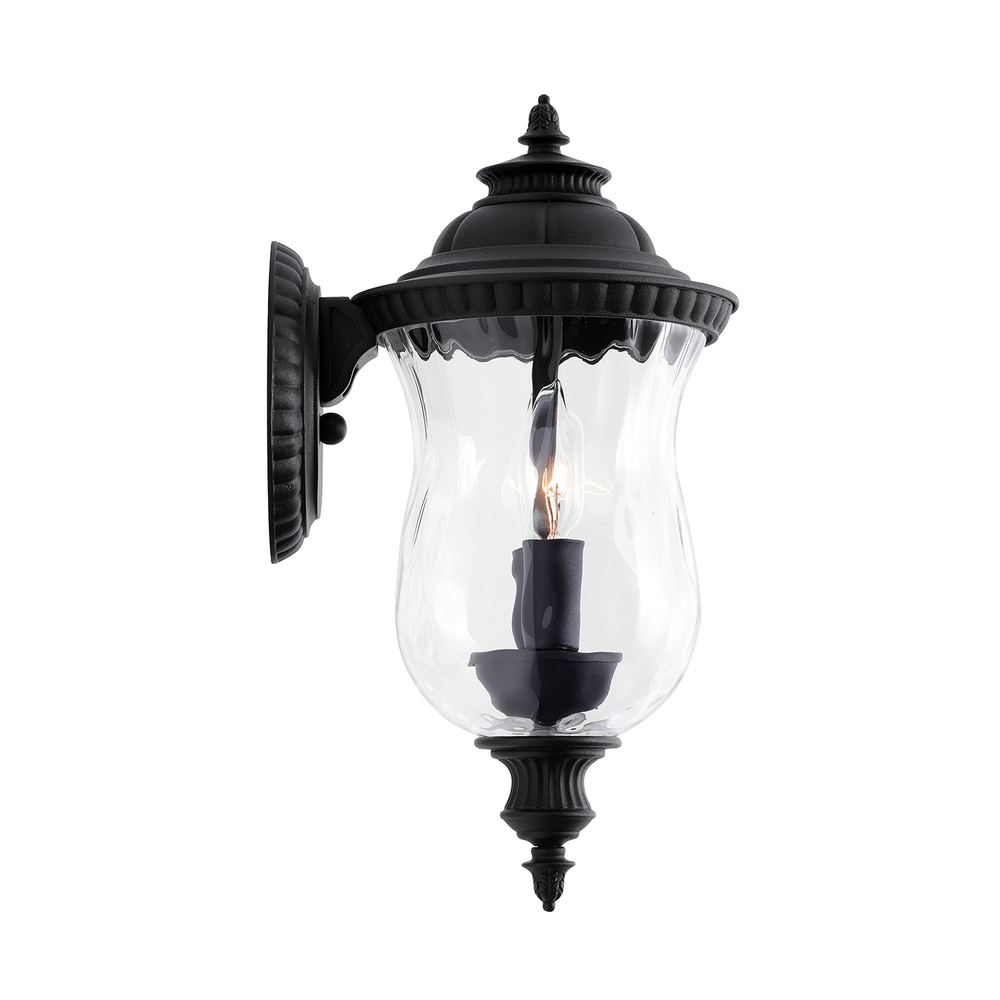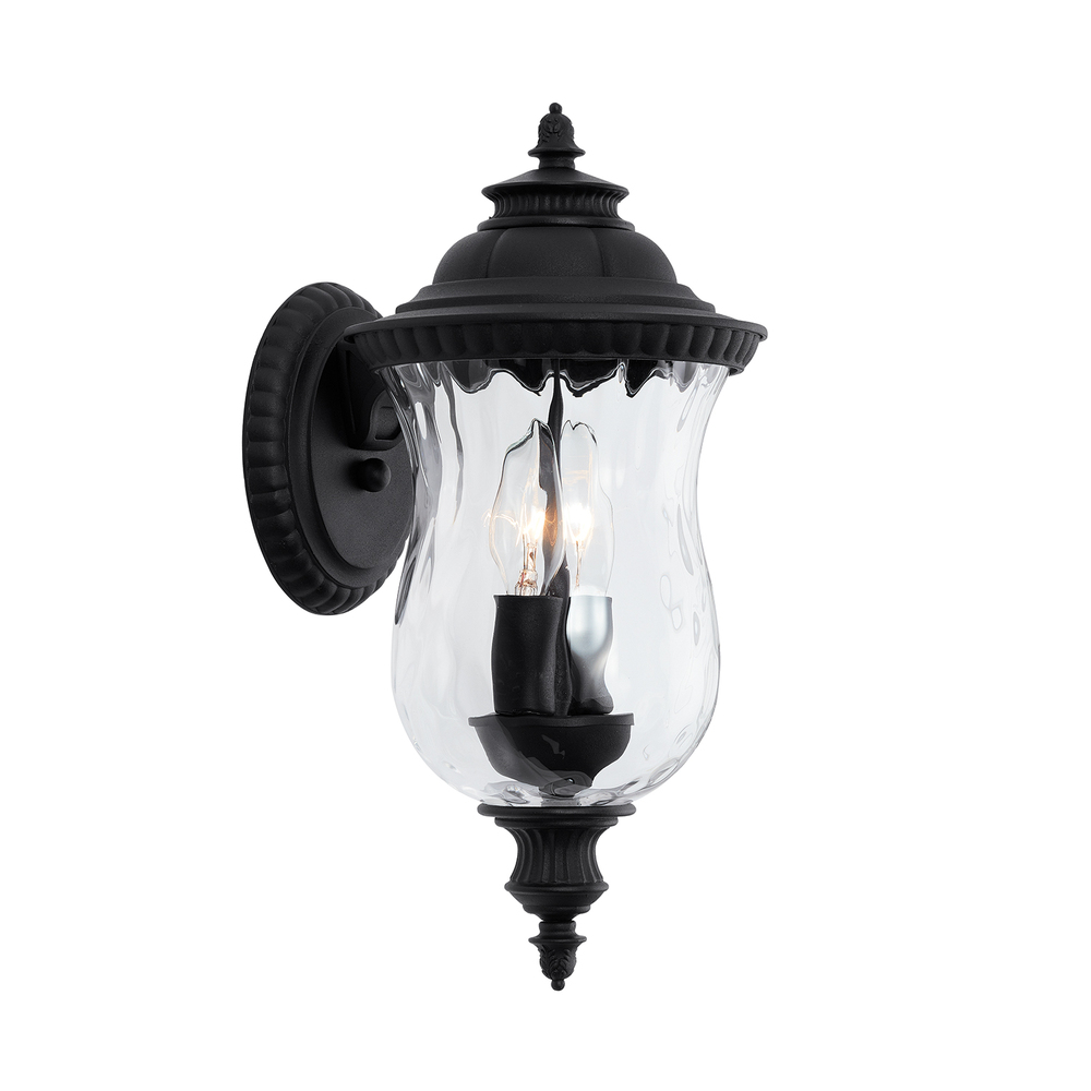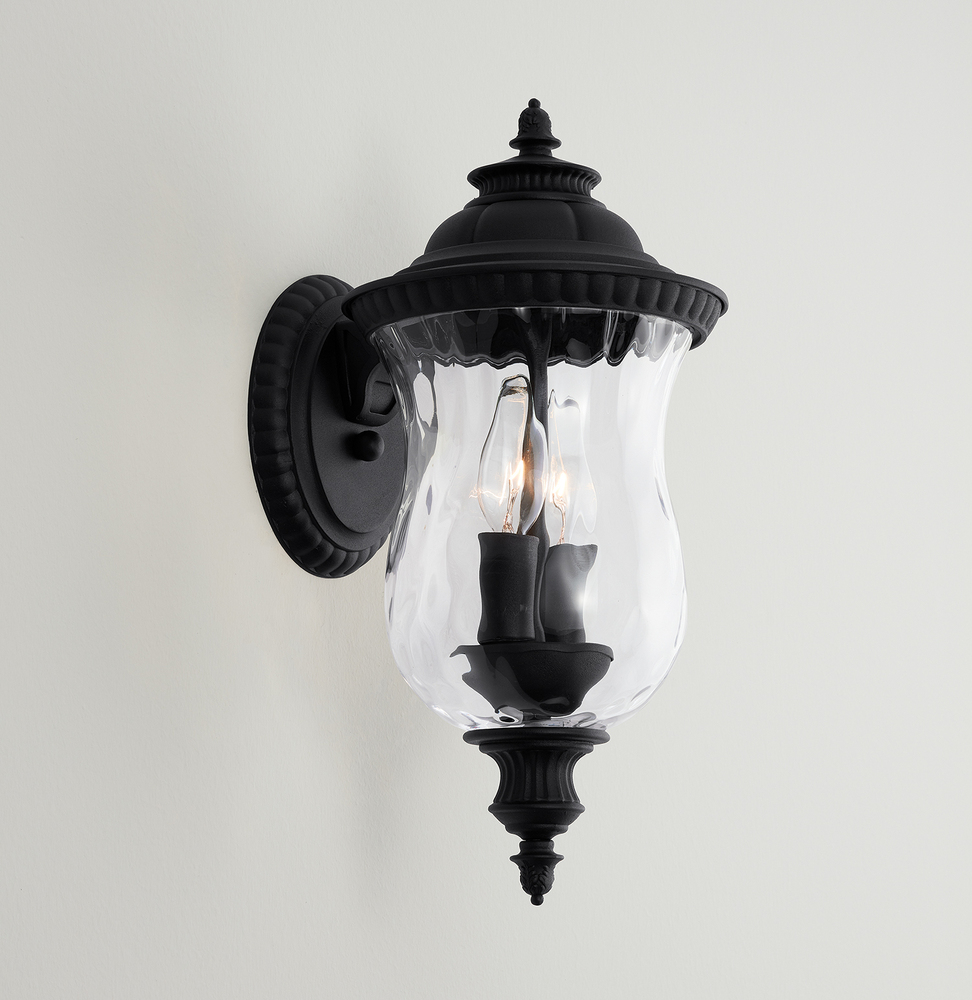 The softly textured clear water glass of our Ashford 2-light small wall lantern is beautifully complemented by the ornate domed top and finial, finished in our Black finish. Inside, two candle-style bulbs provide elegant illumination for your traditional home's exterior. The Ashford wall lantern is also available in our classic Old Bronze finish.