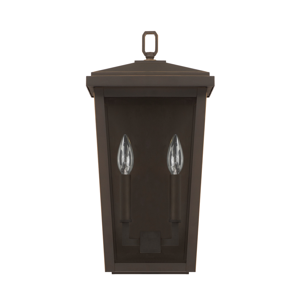 Two-light outdoor wall lantern with Oiled Bronze finish and clear glass.