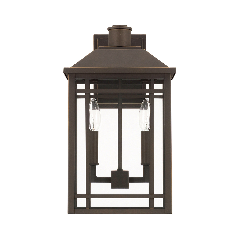 Two-light outdoor wall lantern with Oiled Bronze finish and clear glass.