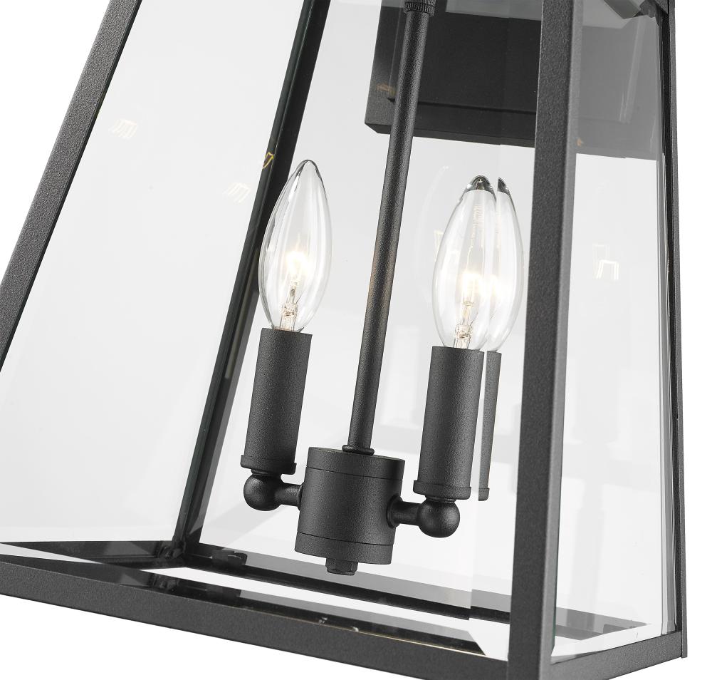 Repurposed village nautical vibes shape an exceptional feel of romance and history in the Broughton two-light outdoor wall sconce. This fixture creates a romantic feel with candelabra bulb mounts visible from an angled lantern-style black aluminum frame with clear beveled glass panels. Choose this sconce to embellish the custom details of any exterior structure.