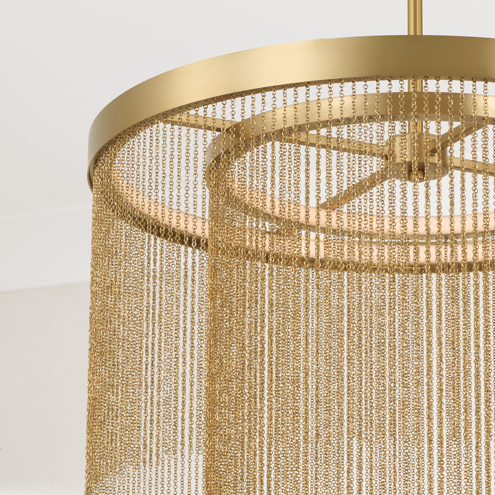 Exquisite from every angle, the Rae Pendant exudes vintage glamour with a touch of modern functionality. Illuminated by nestled rings of integrated LEDs, this intricate luminaire is formed of delicate, dangling chains in cascading silhouettes and a classic Aged Brass finish for elegant shine.