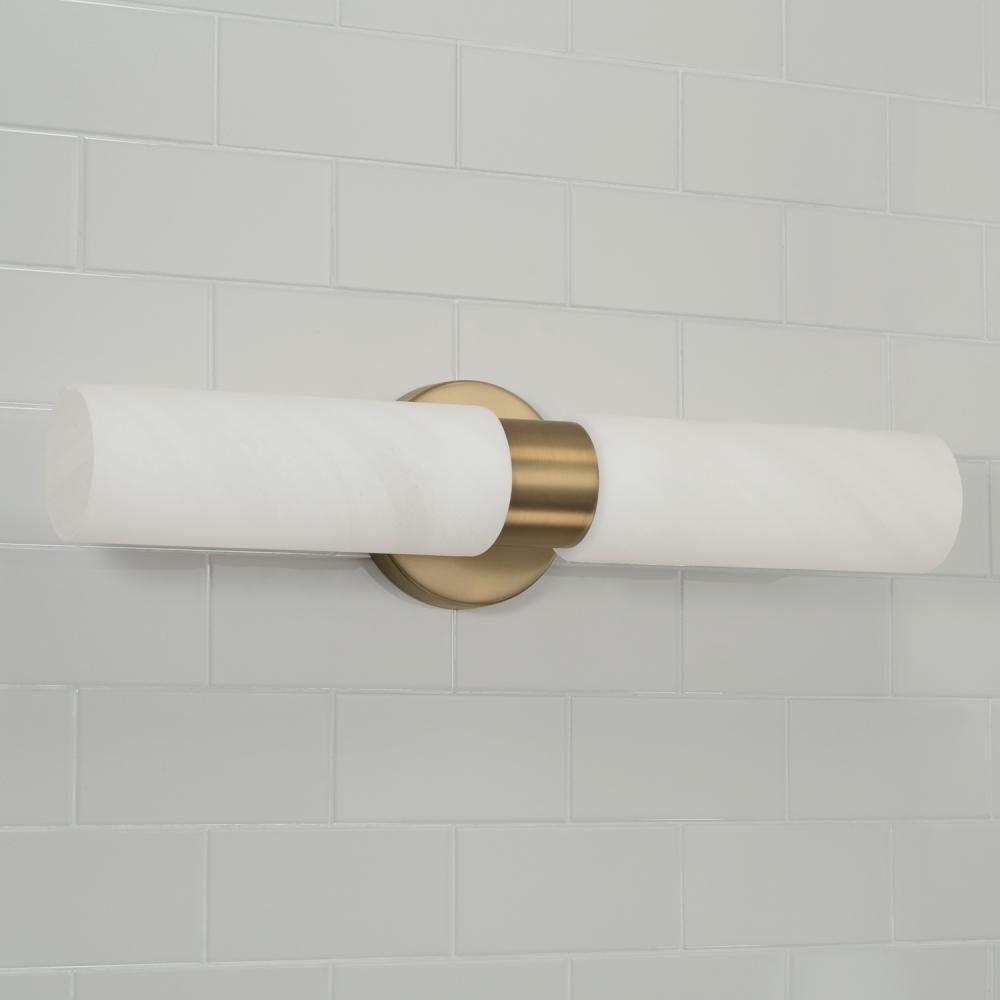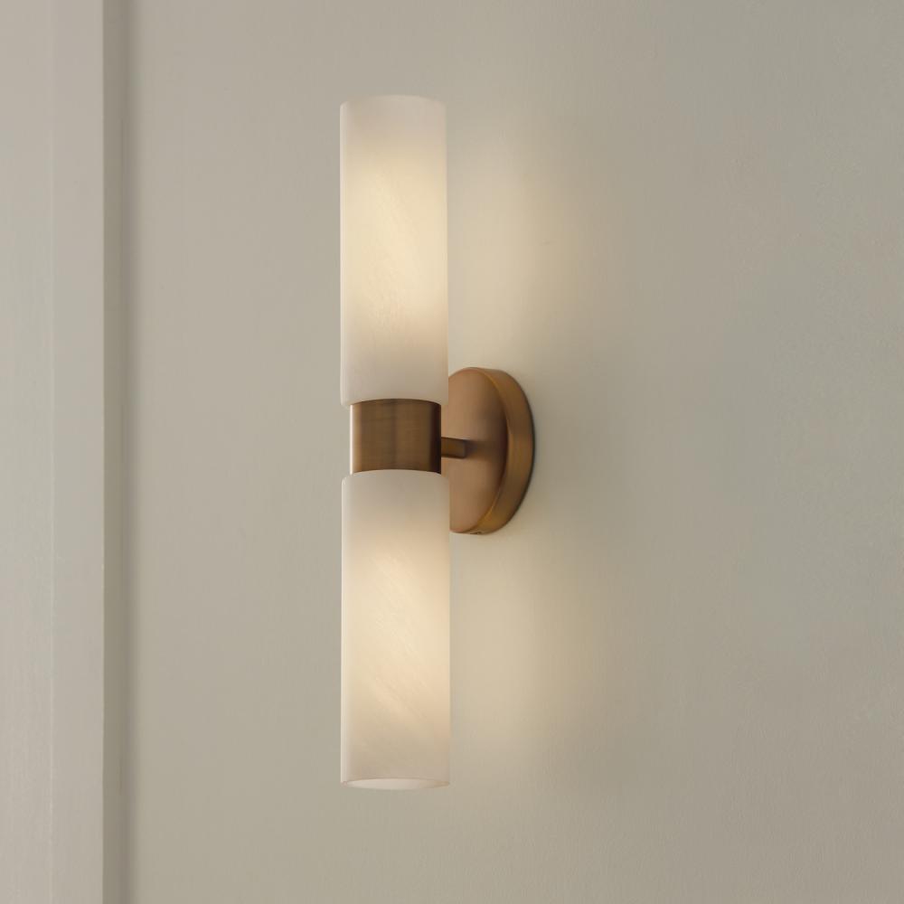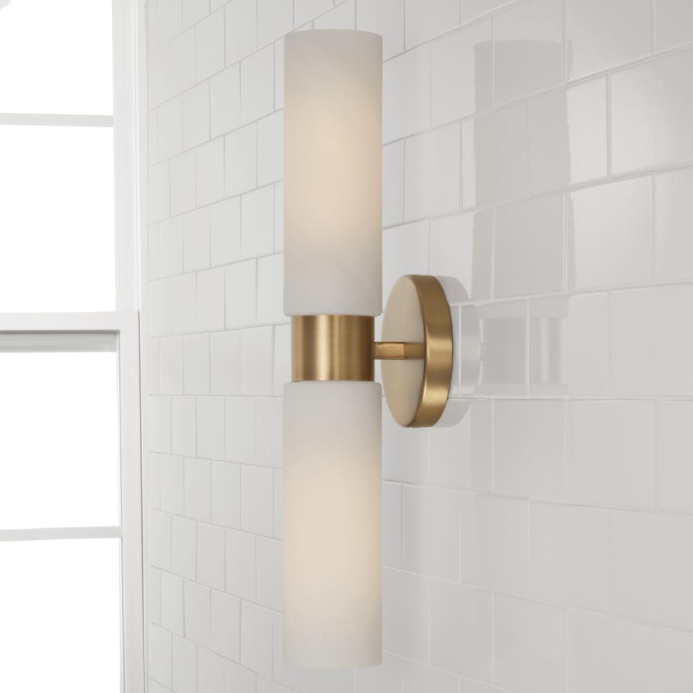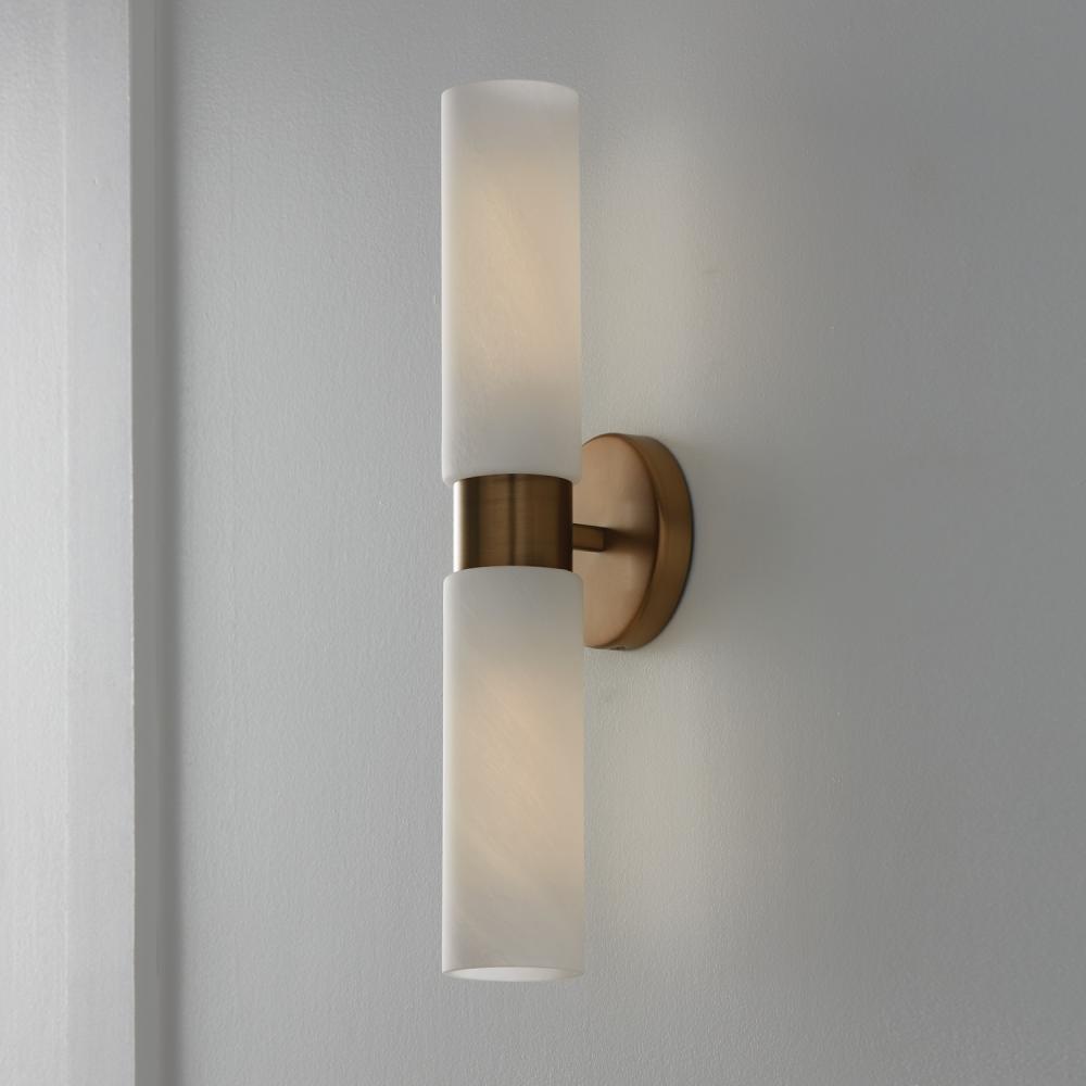Highlight sleek, modern style with the Alyssa 2-Light Sconce. The Aged Brass finish adds warmth to the earthy, elegant Faux Alabaster glass shades, while the elongated lines deliver sophisticated style. Horizontal or vertical hanging capability seamlessly suits any space.