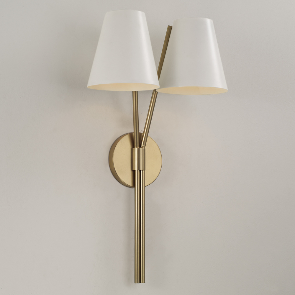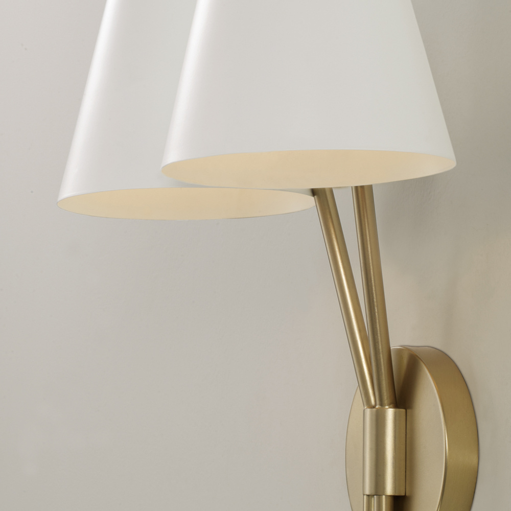Seamlessly blending classic style with modern elements, the Cami Double Sconce brings mixed-metal elegance in a sleek silhouette. The tapered White metal shades sit atop the slender Aged Brass arms, creating a contemporary two-tone look.