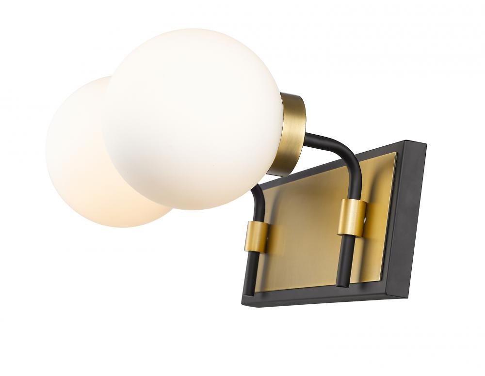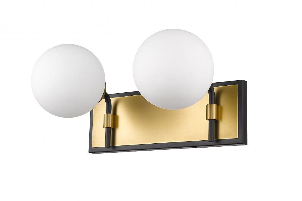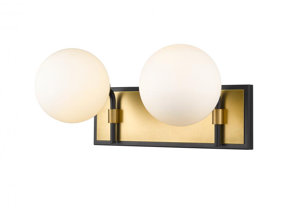 Upgrade the ambiance of your home with this gorgeous two-light vanity. Its crafted with a matte black and olde brass finish and opal shades that deliver a warm radiance. Its ideal for a bathroom, powder room or bedroom with its mix of modern panache and old school lines.