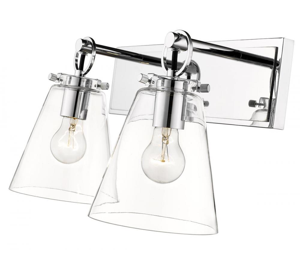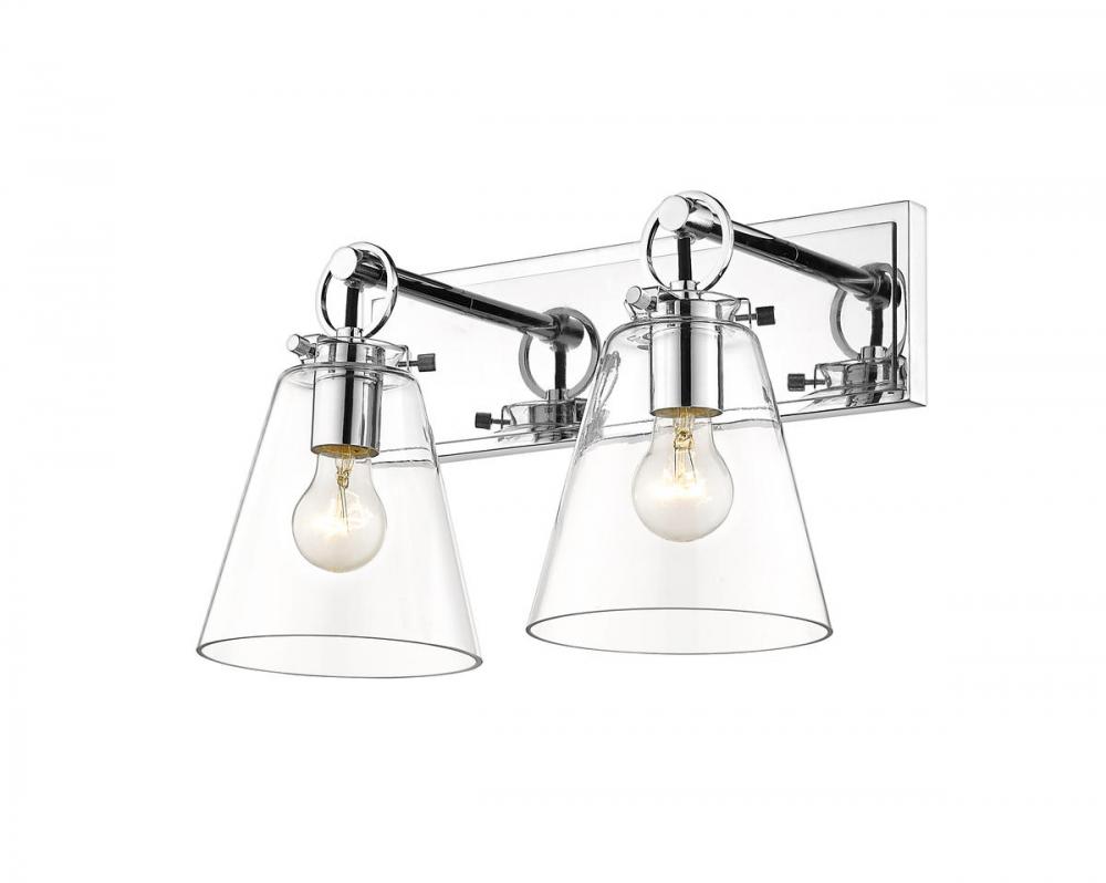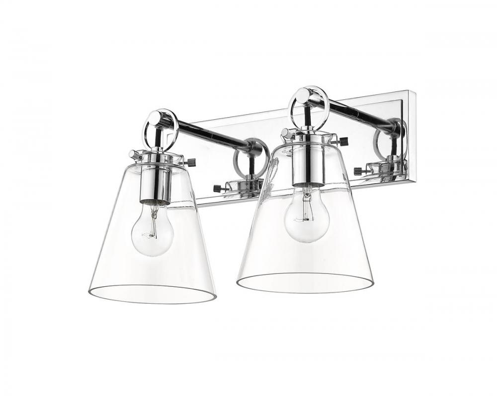 Create a stunning look of fresh design when adding ambient lighting to a custom bath space. Contemporary and inviting, this two-light vanity bath light from the Harper collection keeps it simple yet decadent with a shiny chrome finish over steel composing a rectangular wall mount and accents. Clear glass conical shades add a hint of nautical inspiration.