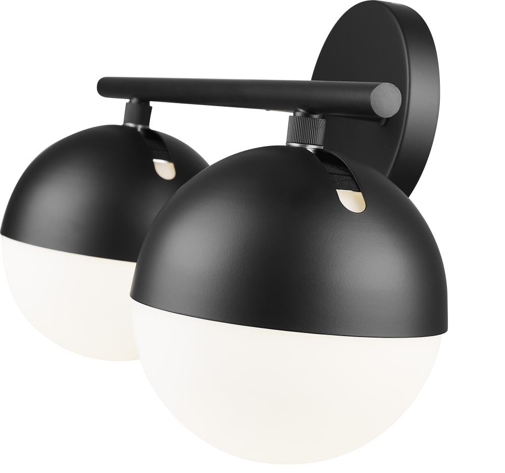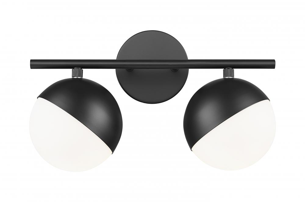 The sharp contrast of a modern matte black finish and white opal glass creates striking flair for this mid-century two-light vanity bath light. Its structured silhouette features orb shades, each with a moveable shield that allows for precise illumination over a vanity or bath. The clean, straightforward design of this fixture blends in a myriad of design motifs, offering stylish allure.