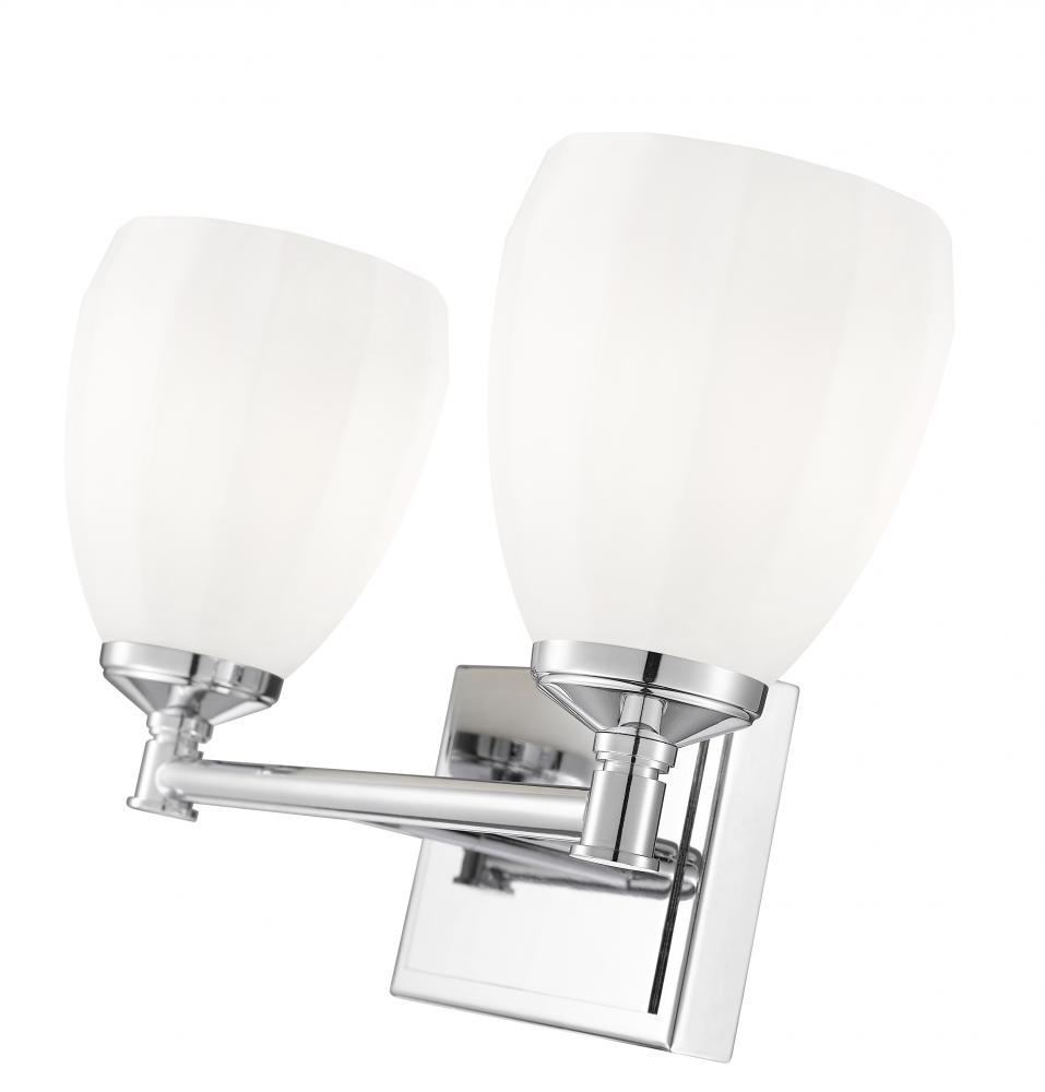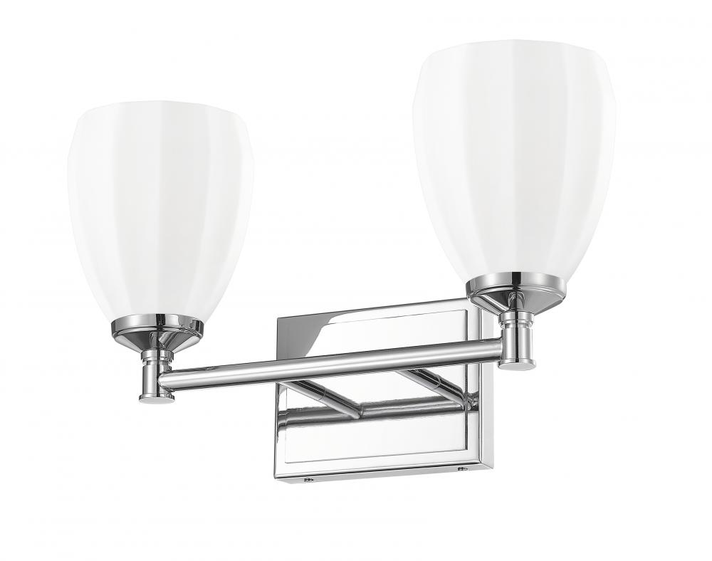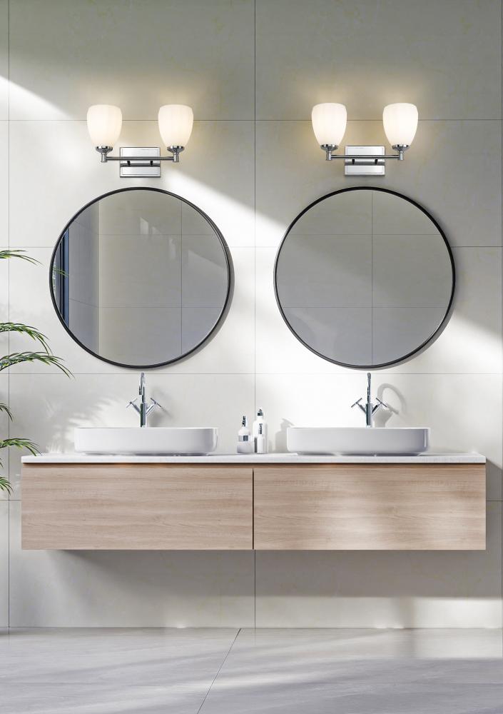 Gleaming chrome adds reflectivity and contemporary pop to the graceful silhouette of a modern two-light vanity sconce. Its simple frame and straight arm are crafted in steel for durability, while matte opal glass shades diffuse illumination and cast a warm, inviting glow. The decorative shade design is a fresh, refined touch perfect for an upgrade in your bath.