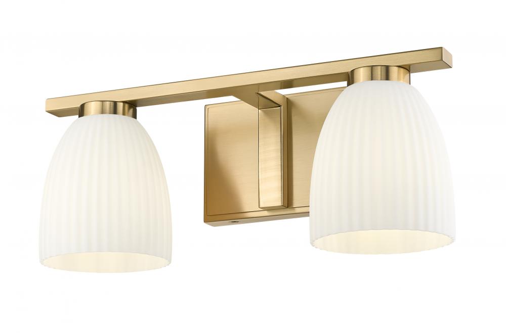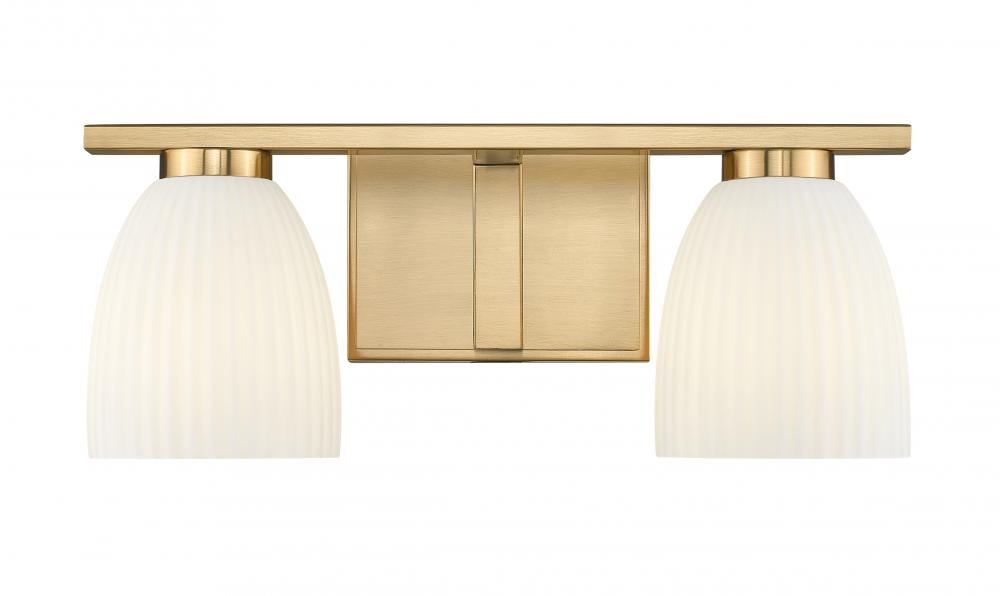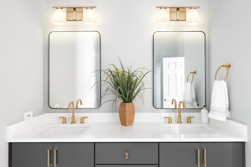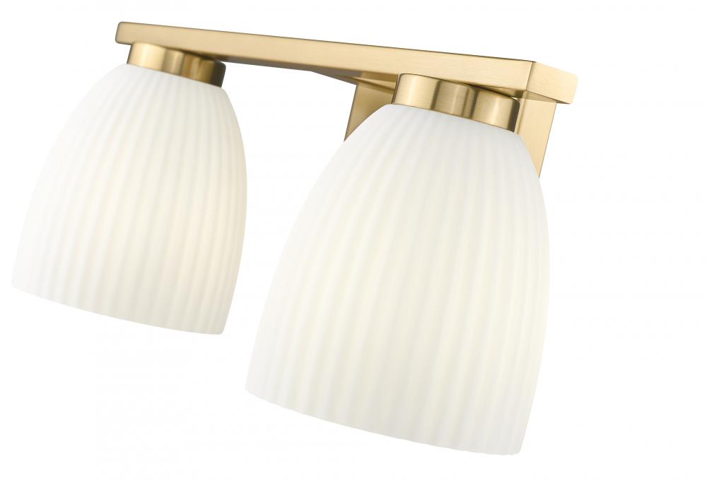 Bathed in a modern gold finish and balanced by matte opal glass, this two-light vanity fixture offers a blend of elegance and subtle texture. The ribbed opal shades cast a soft glow that flatters every reflection. Its polished silhouette brings warmth and grace to daily rituals.