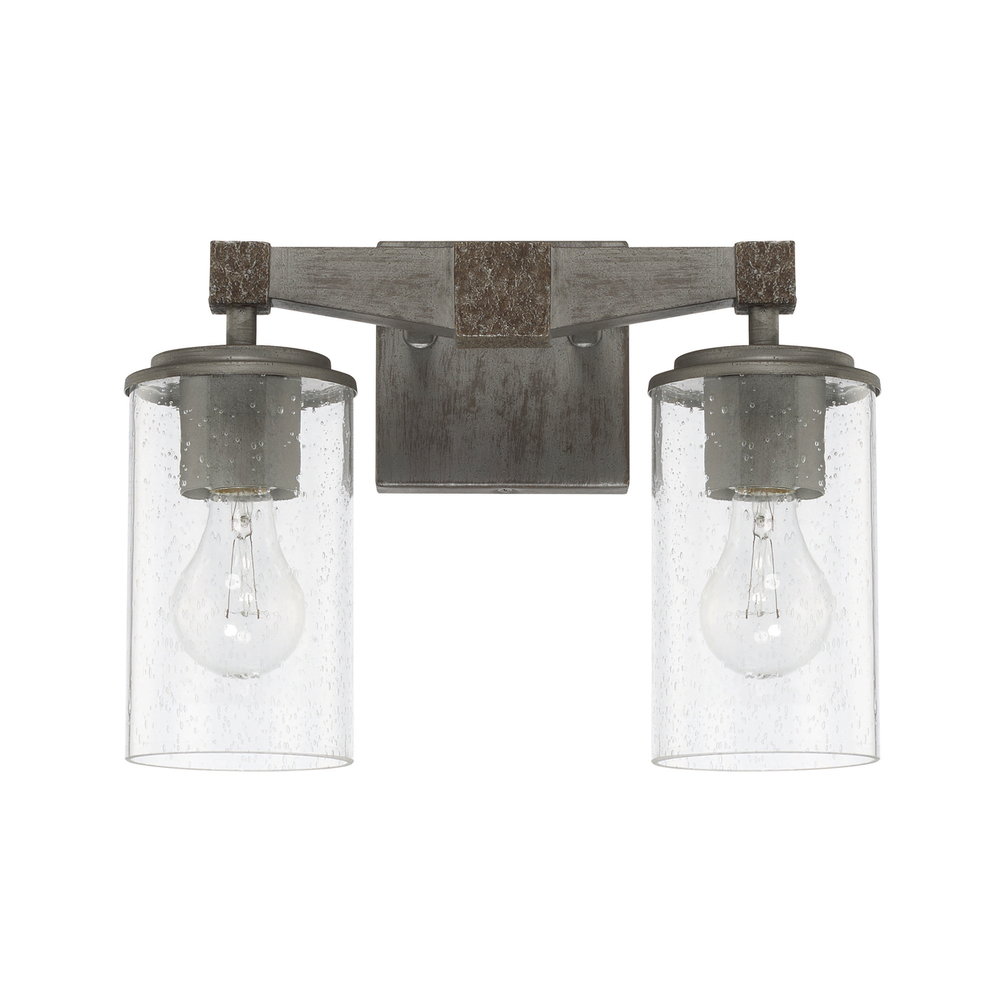 The Zac Collection stands out with its blend of textures and finishes offering a nod to urban loft style. The Zac vanity light adds Seeded glass to the mix. Brackets feature a hammered texture and a darker finish with silvery highlights, set against a frame that features a lighter, visually distressed, silvery grey finish. This bath vanity is your answer for a powder room or bath in need of urban or industrial character.