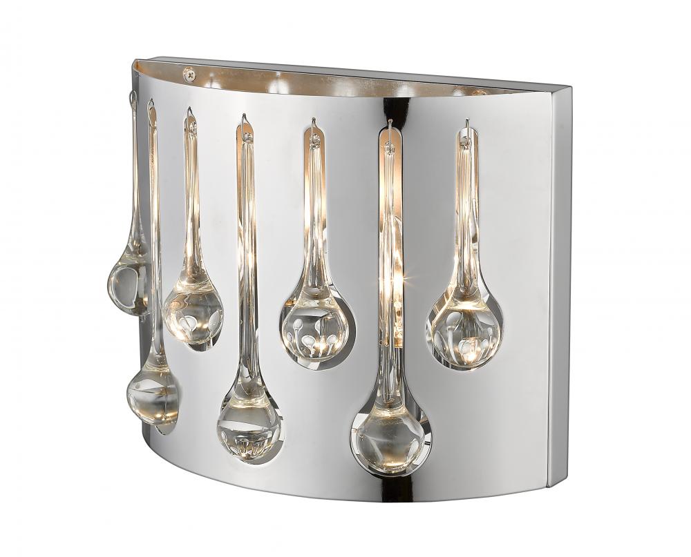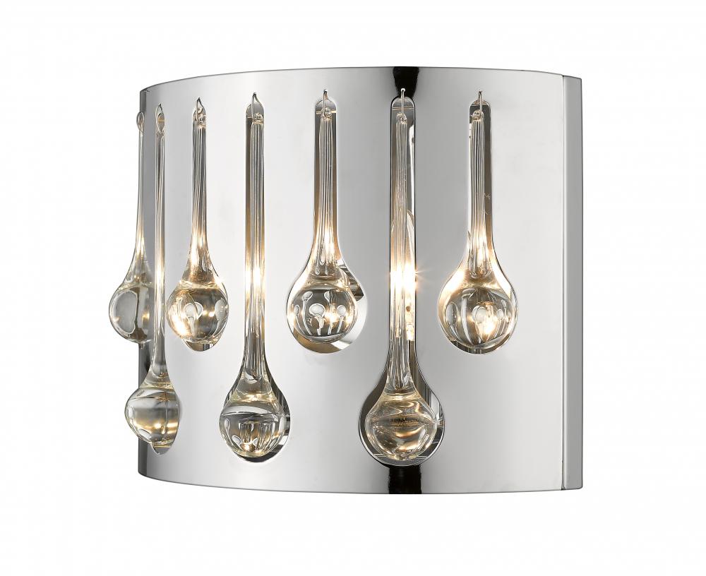 Experience a royal motif in elegant chrome and crystal, and add this two-light wall sconce for spot lighting. A contemporary vibe with softened transitional touches from droplets of crystal glass deliver a visually captivating look.